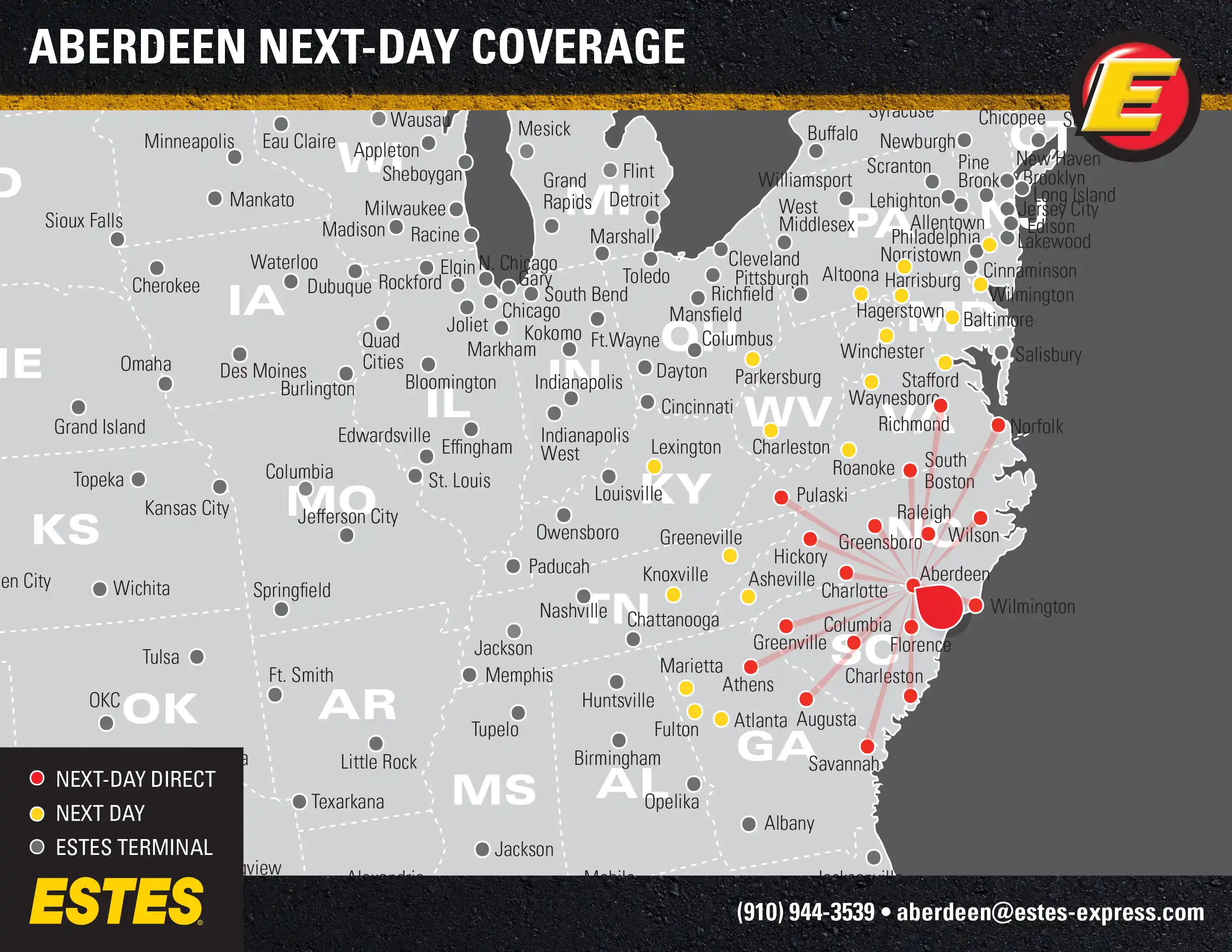 Estes offers next-day direct LTL freight shipping from the Fayetteville area to Charlotte, Raleigh, Richmond, Norfolk, Greensboro, Savannah, Columbia, and Charleston, SC, as well as next-day LTL to Atlanta, Philadelphia, DC, Baltimore, Lexington, Knoxville, and more.