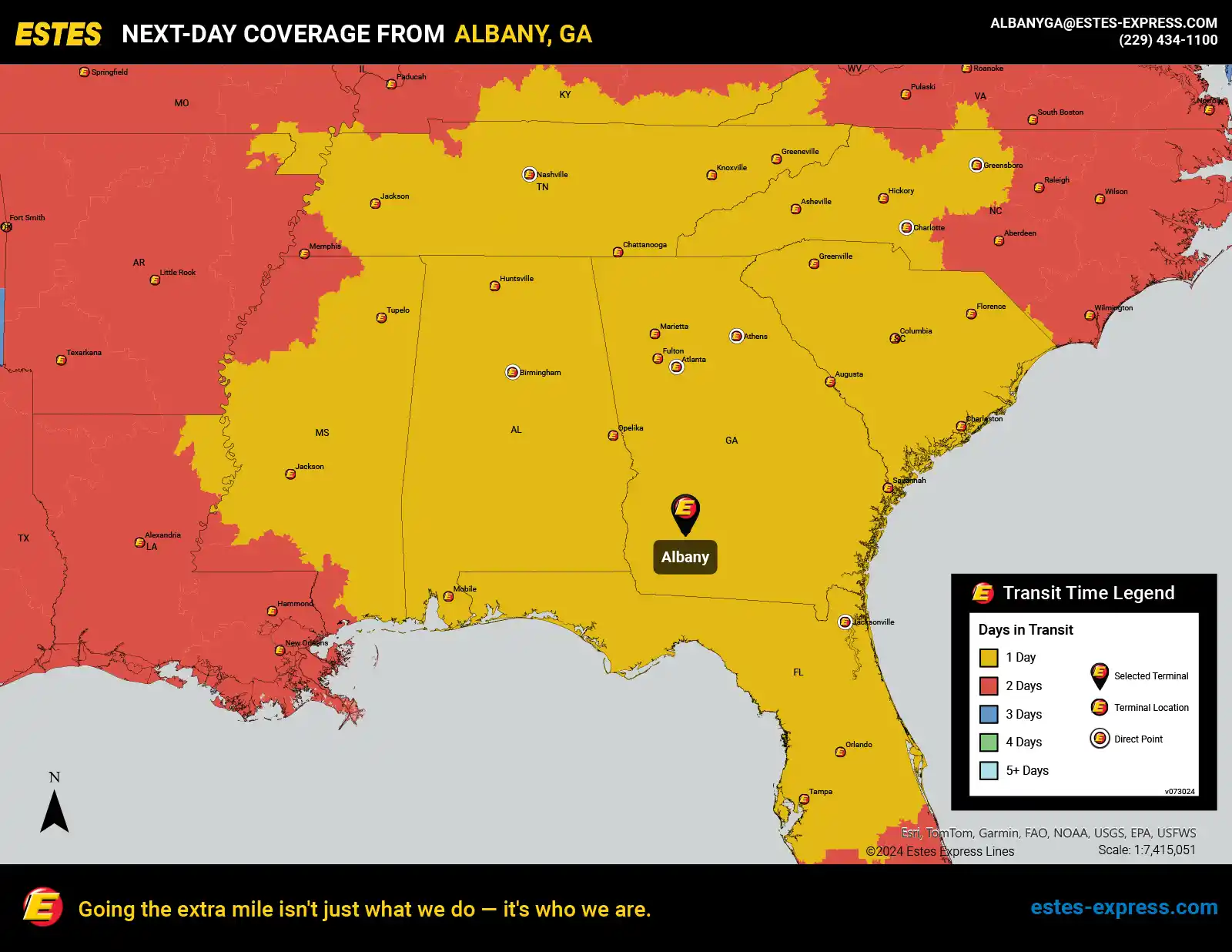 Estes offers next-day LTL freight shipping and trucking services from the Tallahassee-Albany-Dothan area to Miami, Atlanta, Charlotte, Jacksonville, Nashville, Orlando, Tampa, Mobile, Huntsville, Savannah, Greensboro—and more.