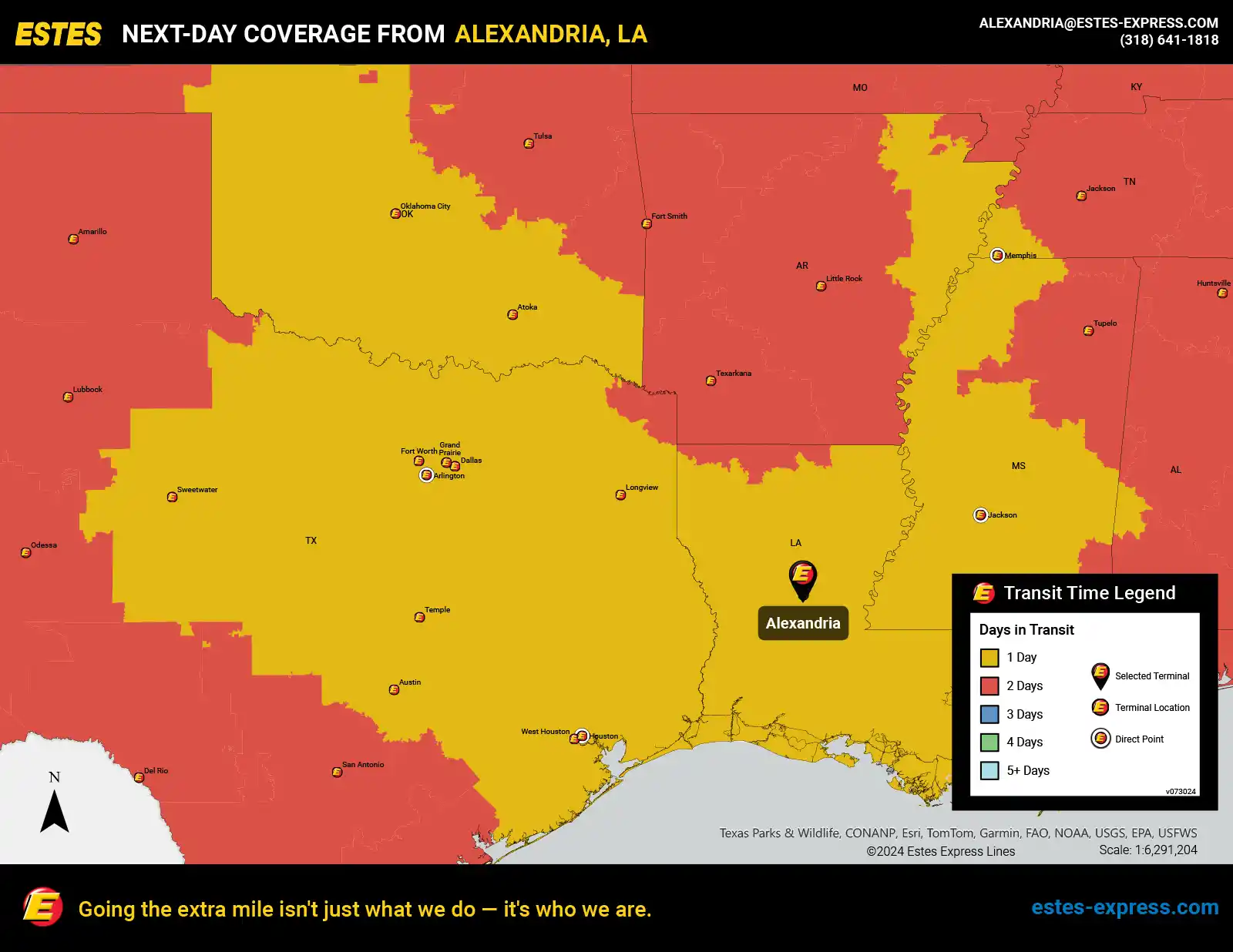 Estes offers next-day LTL freight shipping from the Lafayette-Lake Charles-Alexandria area to Houston, Dallas, Fort Worth, Oklahoma City, New Orleans, Memphis, Baton Rouge, Jackson—and more.
