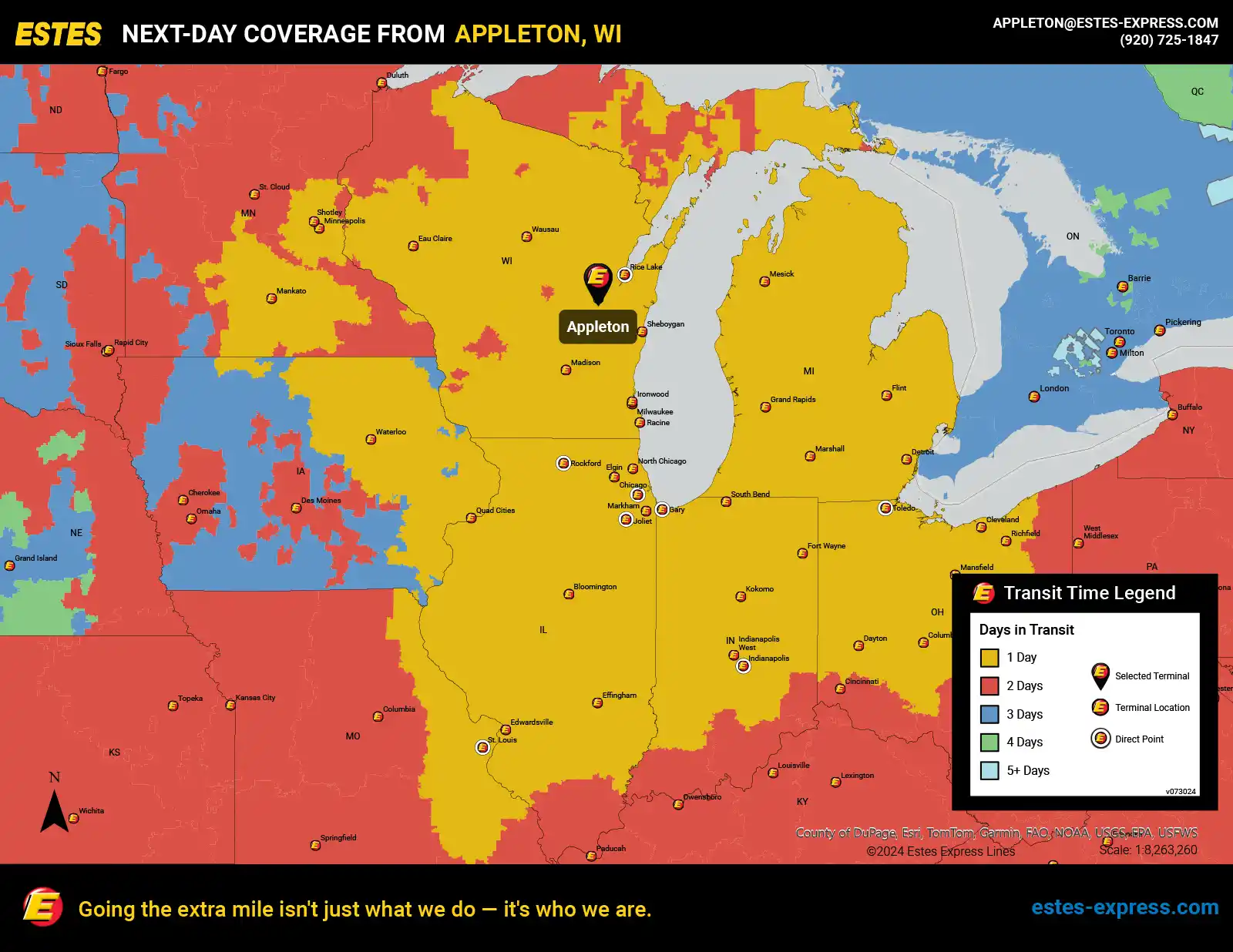 Estes offers next-day LTL freight shipping from the Appleton-Green Bay-Oshkosh area to destinations throughout the Midwest and Great Lakes regions.
