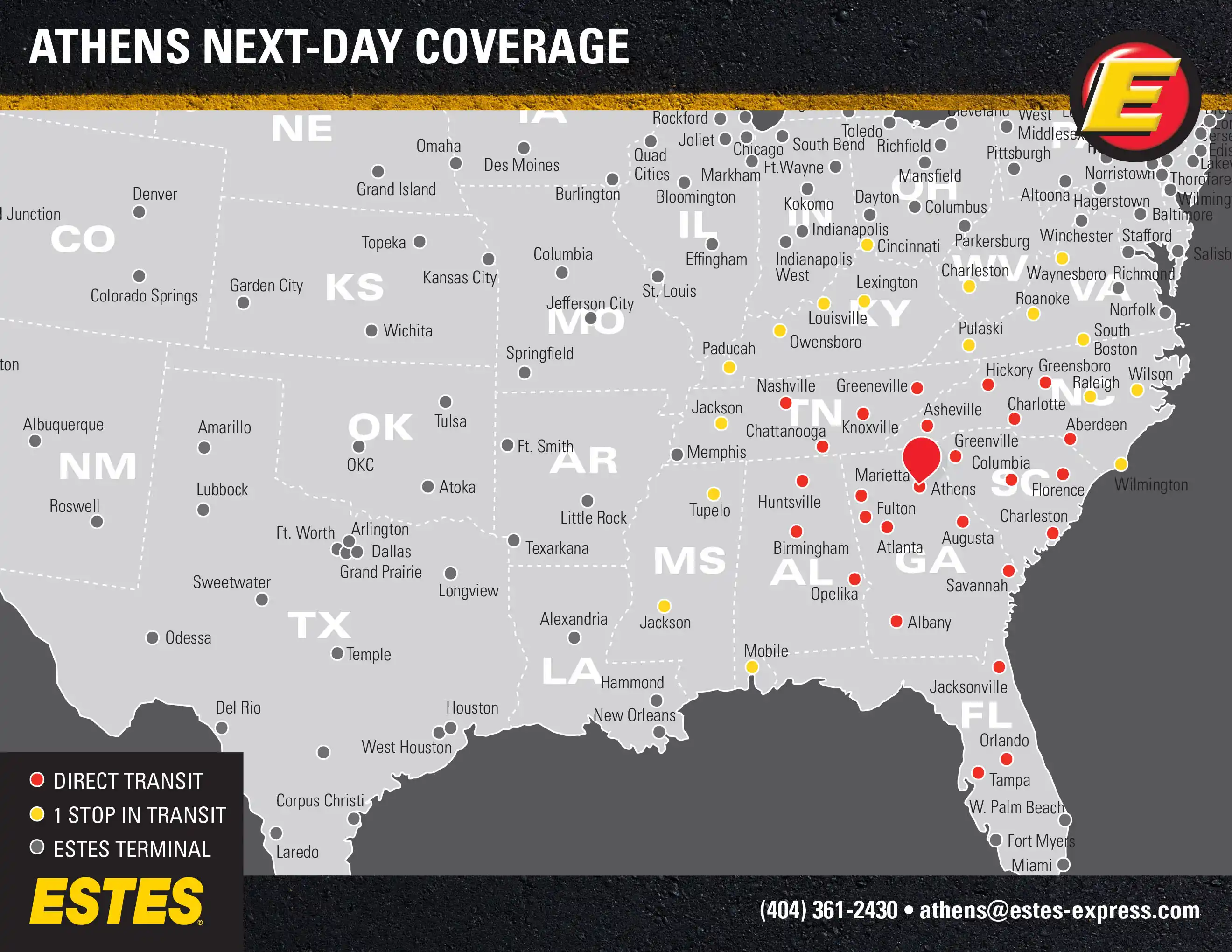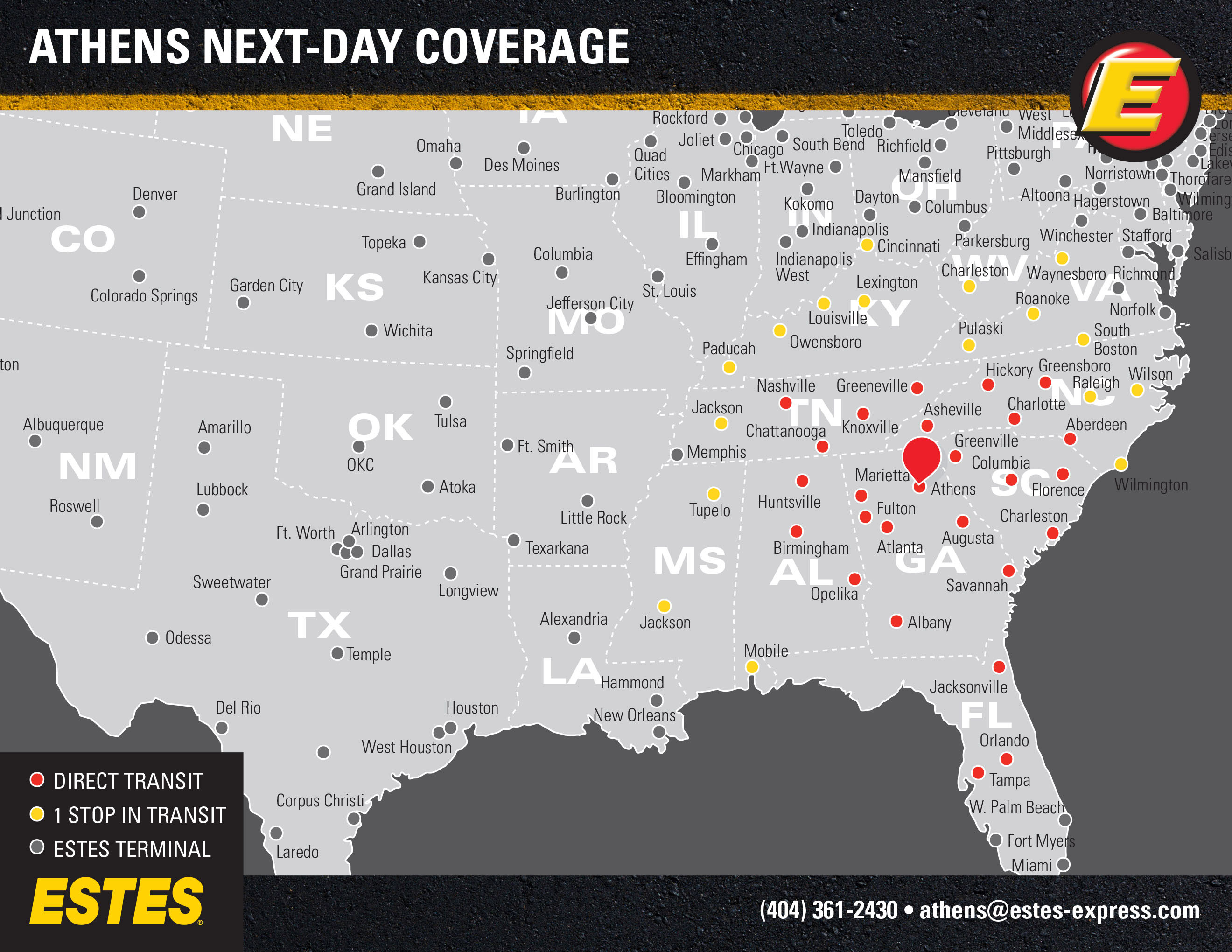 As one of our 26 hub terminals, Athens provides direct lanes to terminals throughout the region—each running every night like clockwork while offering reduced freight handling and superior reliability.