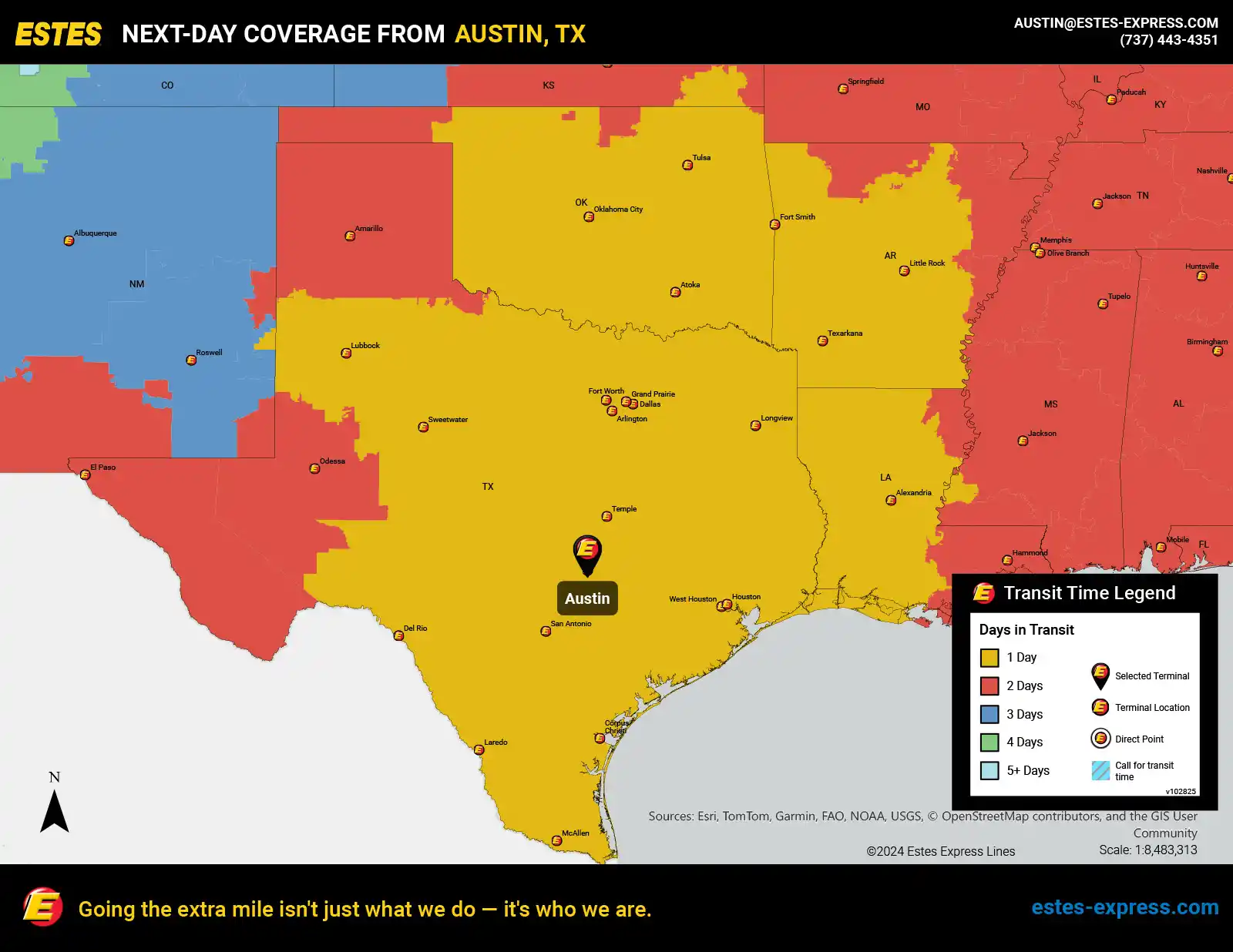 Need reliable LTL freight shipping? Estes offers next-day LTL lanes from Austin to Houston, Dallas, San Antonio, Fort Worth, Oklahoma City, Tulsa, Arlington, Little Rock, McAllen, Lubbock, Laredo—and more.