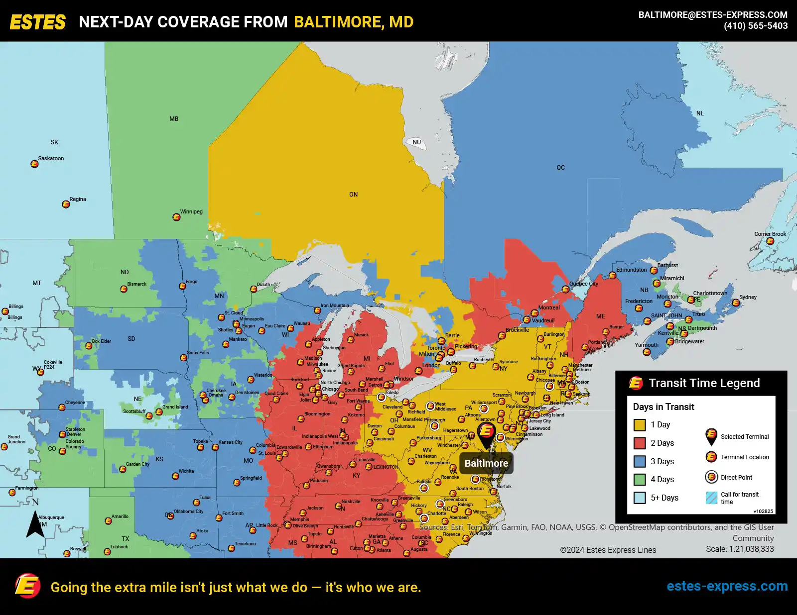 Need reliable LTL freight shipping? Estes offers next-day direct lanes from the Baltimore-Bethesda-Annapolis area to Charlotte, Pittsburgh, Toledo, Richmond, Greensboro, and Wilmington, as well as next-day shipping to NYC, Toronto, DC, Boston, Cincinnati, Cleveland, Columbus, Buffalo, Raleigh, Syracuse, New Haven—and more.