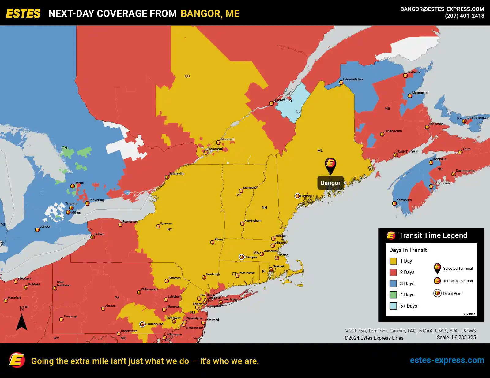 Estes offers next-day LTL freight shipping from the Bangor area to NYC, Philadelphia, Boston, Montreal, New Haven, Syracuse, Albany, Allentown, Scranton, Wilmington DE, Fredericton NB—and more.