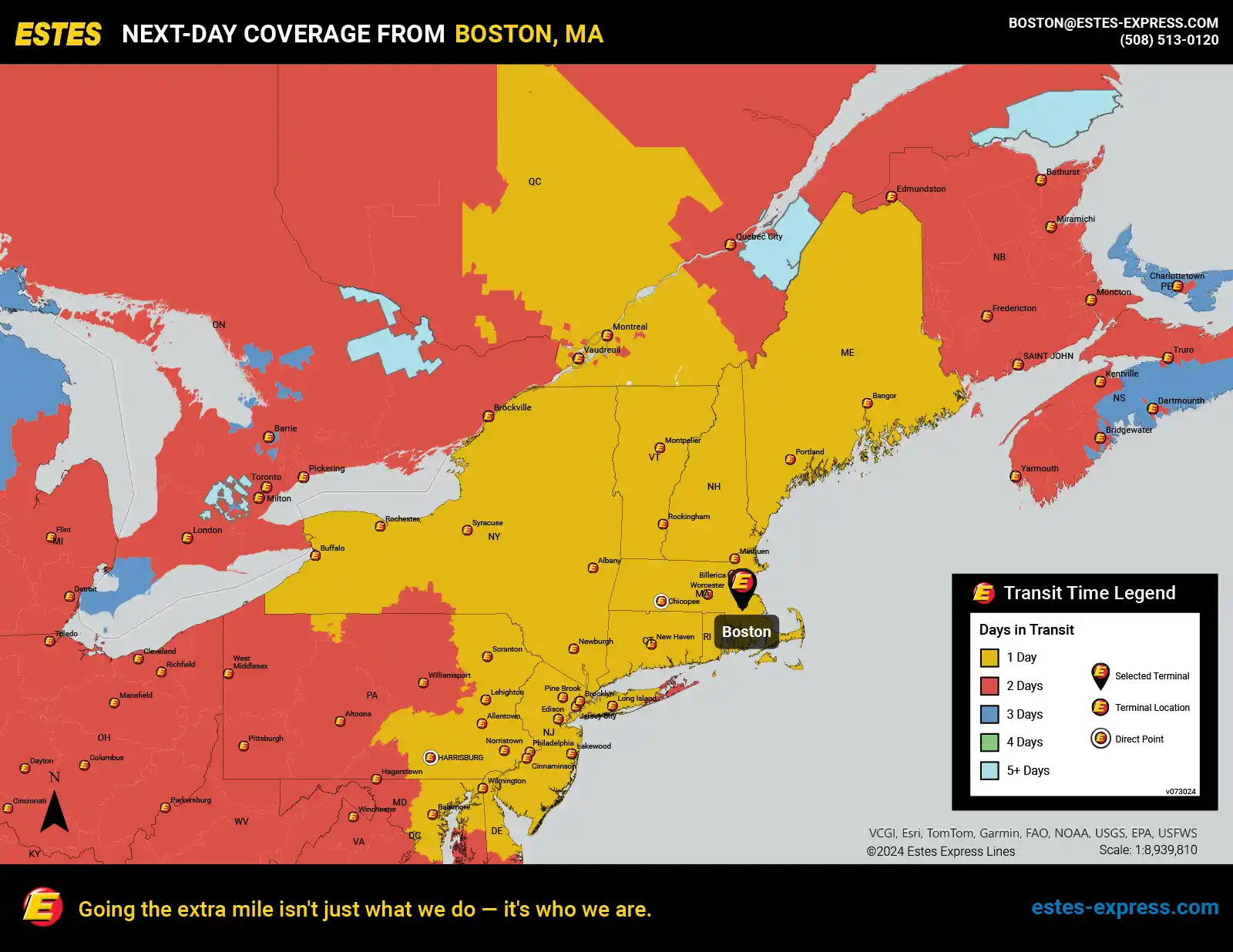 Estes offers next-day LTL freight shipping from Boston to NYC, Philadelphia, Montreal, DC, Baltimore, Buffalo, New Haven, Albany, Syracuse, Portland—and everywhere in between.