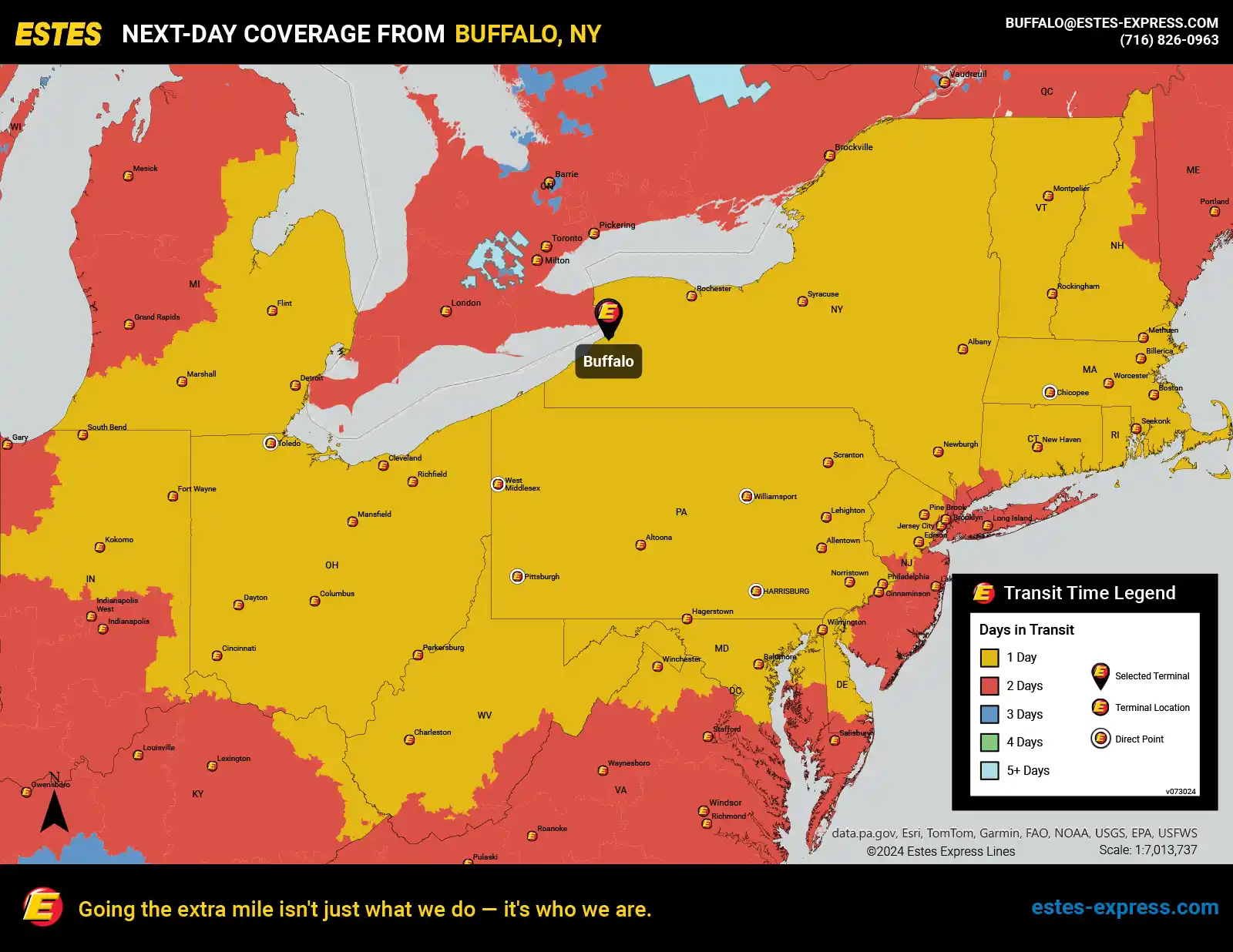 Estes offers next-day LTL freight shipping from the Buffalo-Niagara Falls area to Philadelphia, DC, Boston, Pittsburgh, Cincinnati, Detroit, Baltimore, New Haven, Albany, Syracuse, Toledo—and more.