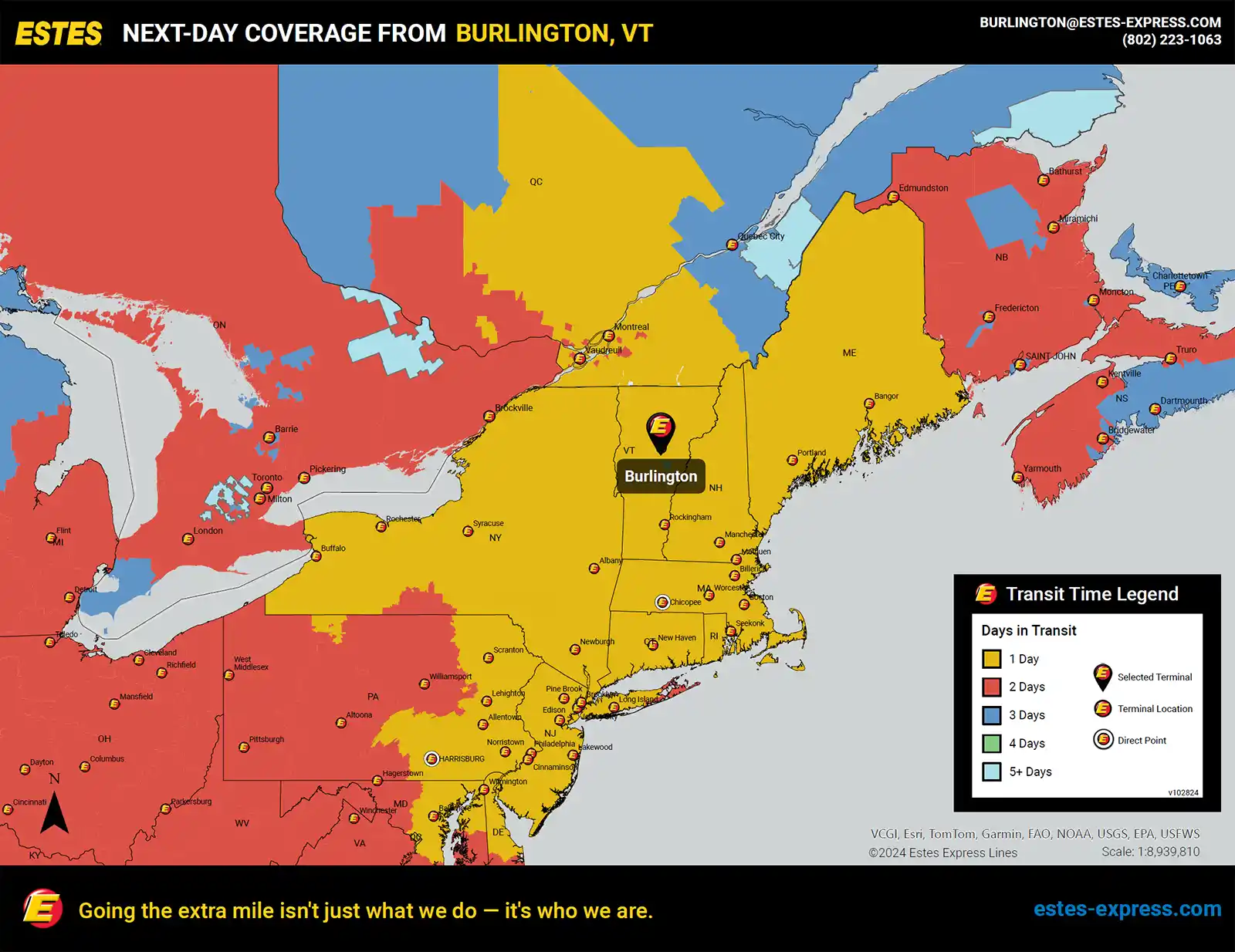 Estes also offers reliable next-day LTL shipping from the Burlington-Montpelier area to Montreal and other Quebec destinations. Our nationwide team of border experts is available round-the-clock to help you navigate language barriers and cross-border documentation. And with more than 500 heated trailers dedicated to our U.S.-to-Canada next-day lanes, we offer some of the best freeze protection in the LTL industry.