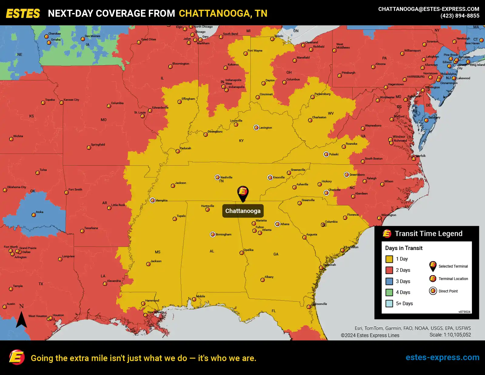 Estes offers next-day LTL freight shipping from Chattanooga to Atlanta, Nashville, Charlotte, Jacksonville, Memphis, Cleveland, Cincinnati, Lexington, Louisville, Knoxville, Birmingham, Mobile—and more.