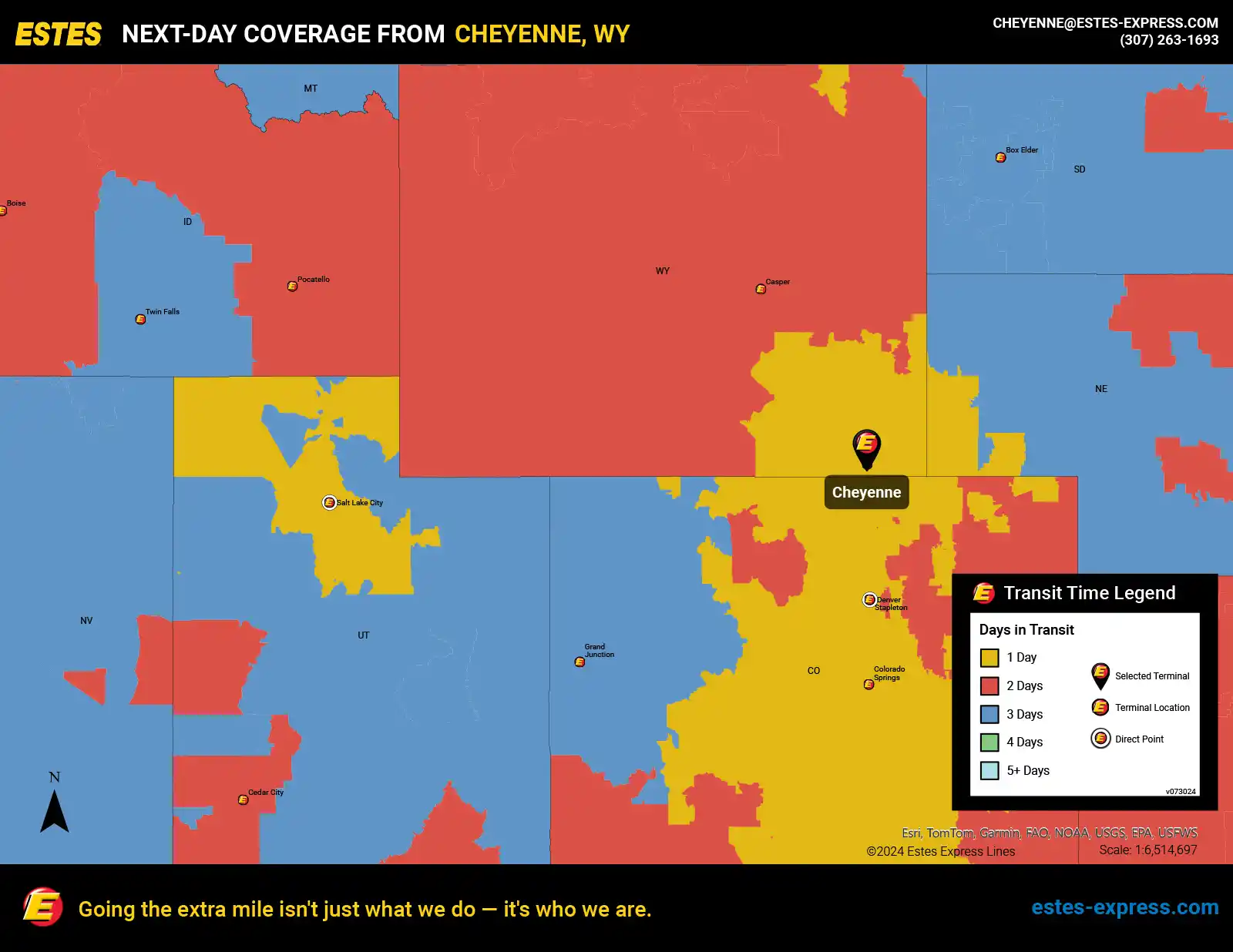 Estes offers next-day LTL freight shipping from Cheyenne to Denver, Salt Lake City, Omaha—and more.