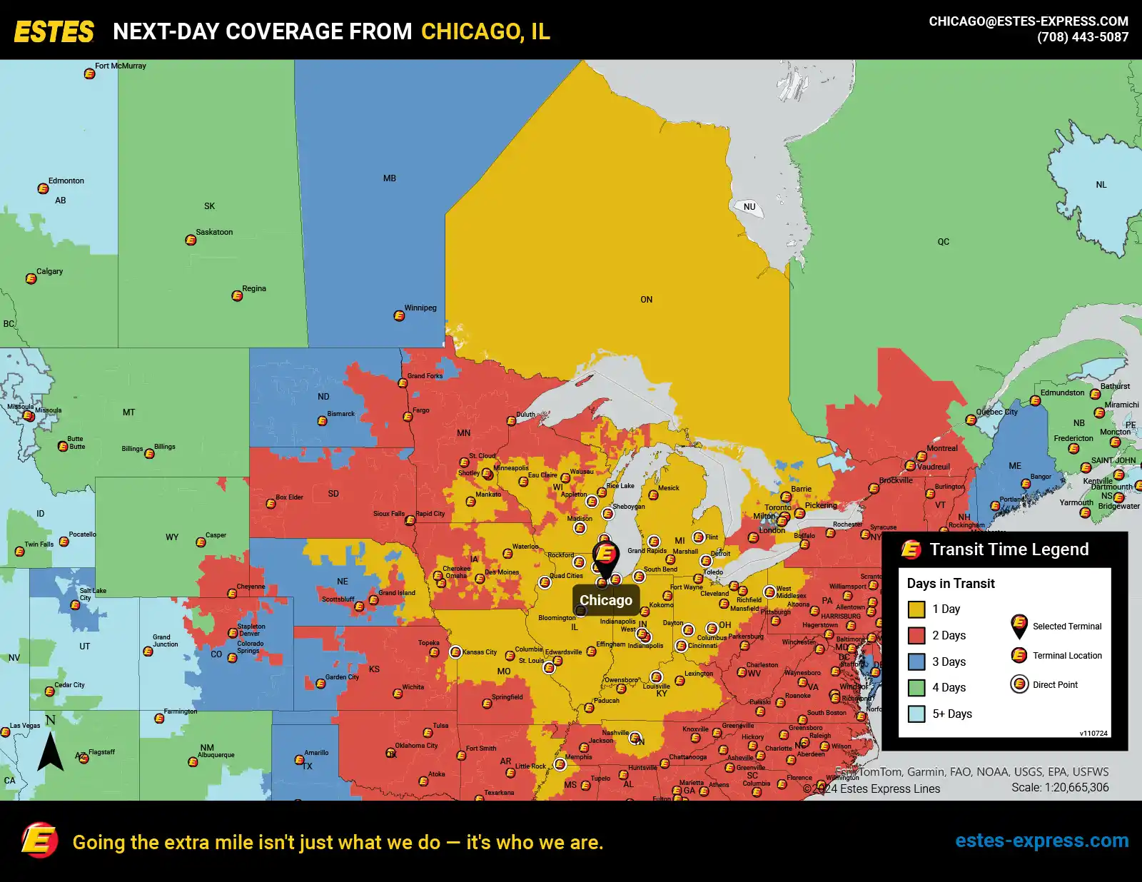 Estes offers next-day LTL freight shipping from Chicago to Indianapolis, Nashville, Detroit, Toronto, Cleveland, Cincinnati, Kansas City, Memphis, Milwaukee, St. Louis, Columbus, Louisville, Omaha, Des Moines—and more.