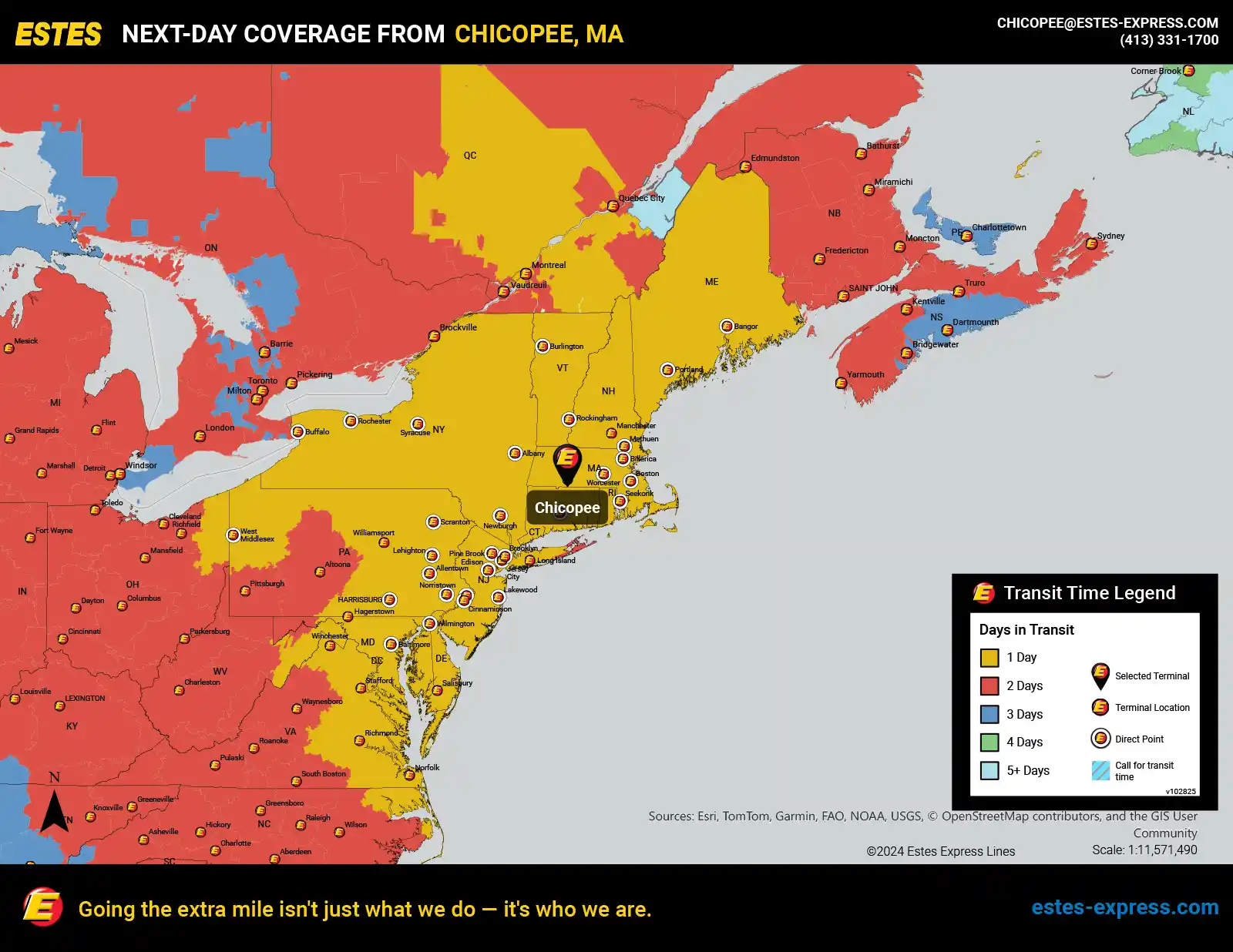 Estes offers next-day direct LTL freight shipping from the Hartford-Springfield-Chicopee area to NYC, Philadelphia, Boston, Buffalo, Baltimore, New Haven, Syracuse, Rochester, Albany, Wilmington, and Portland, as well as next-day LTL to Montreal, Richmond, Norfolk, and more.