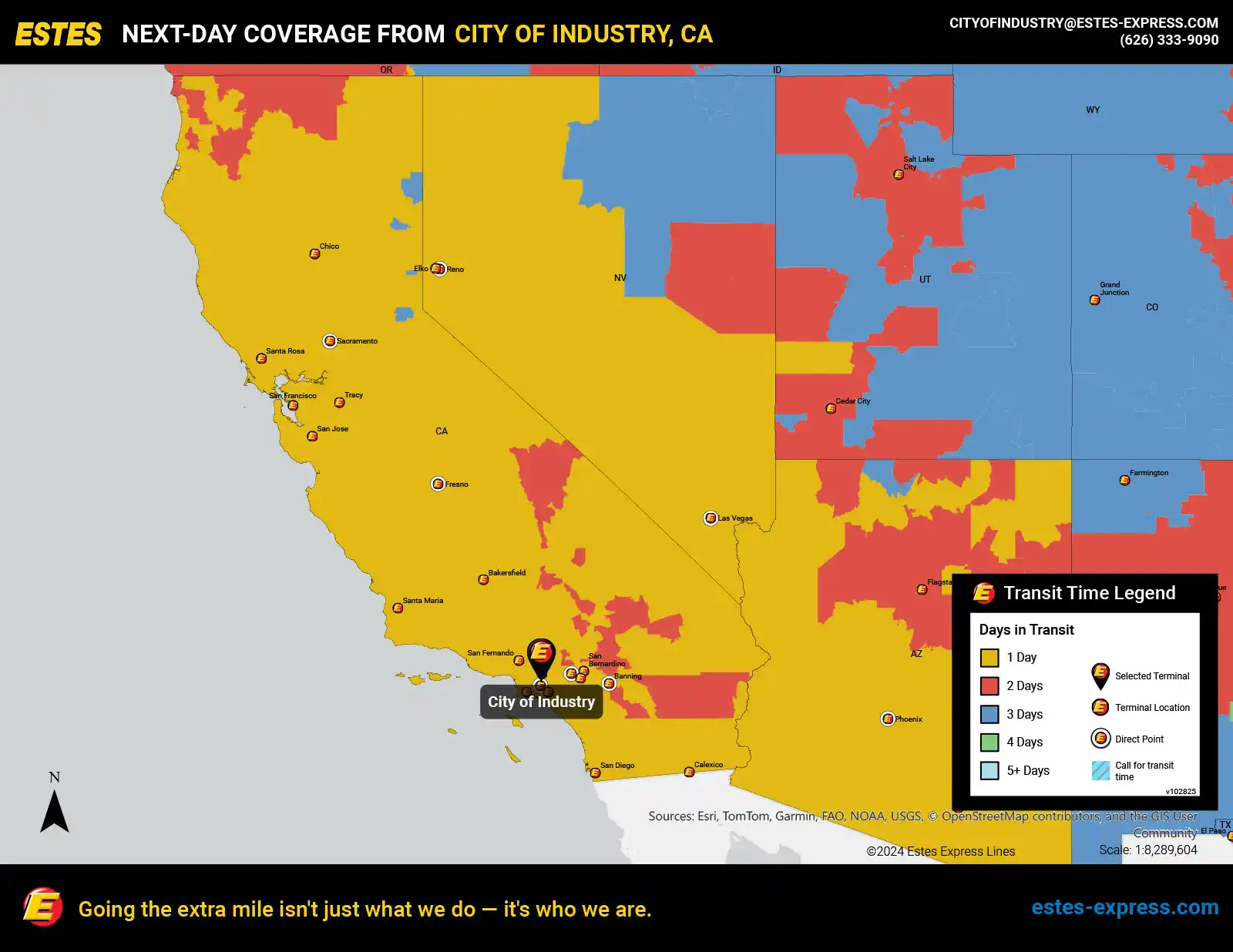 Estes offers next-day LTL freight shipping from the Ontario-Pasadena-City of Industry area to Los Angeles, Phoenix, San Diego, San Francisco, Las Vegas, San Jose, Sacramento, Fresno, Reno, Tucson, Bakersfield, Riverside, San Bernardino, Chico—and more.