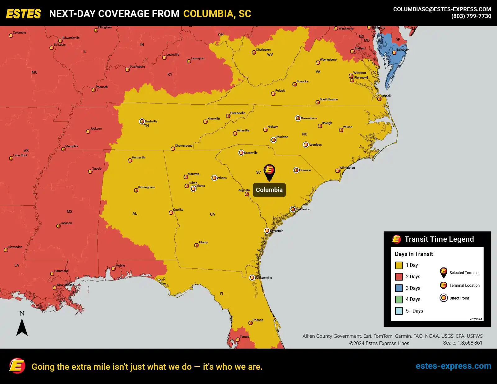 Estes offers next-day LTL freight shipping from Columbia to Atlanta, Charlotte, Jacksonville, Nashville, Orlando, Raleigh, Birmingham, Richmond, Norfolk, Greensboro, Charleston, Savannah—and more.