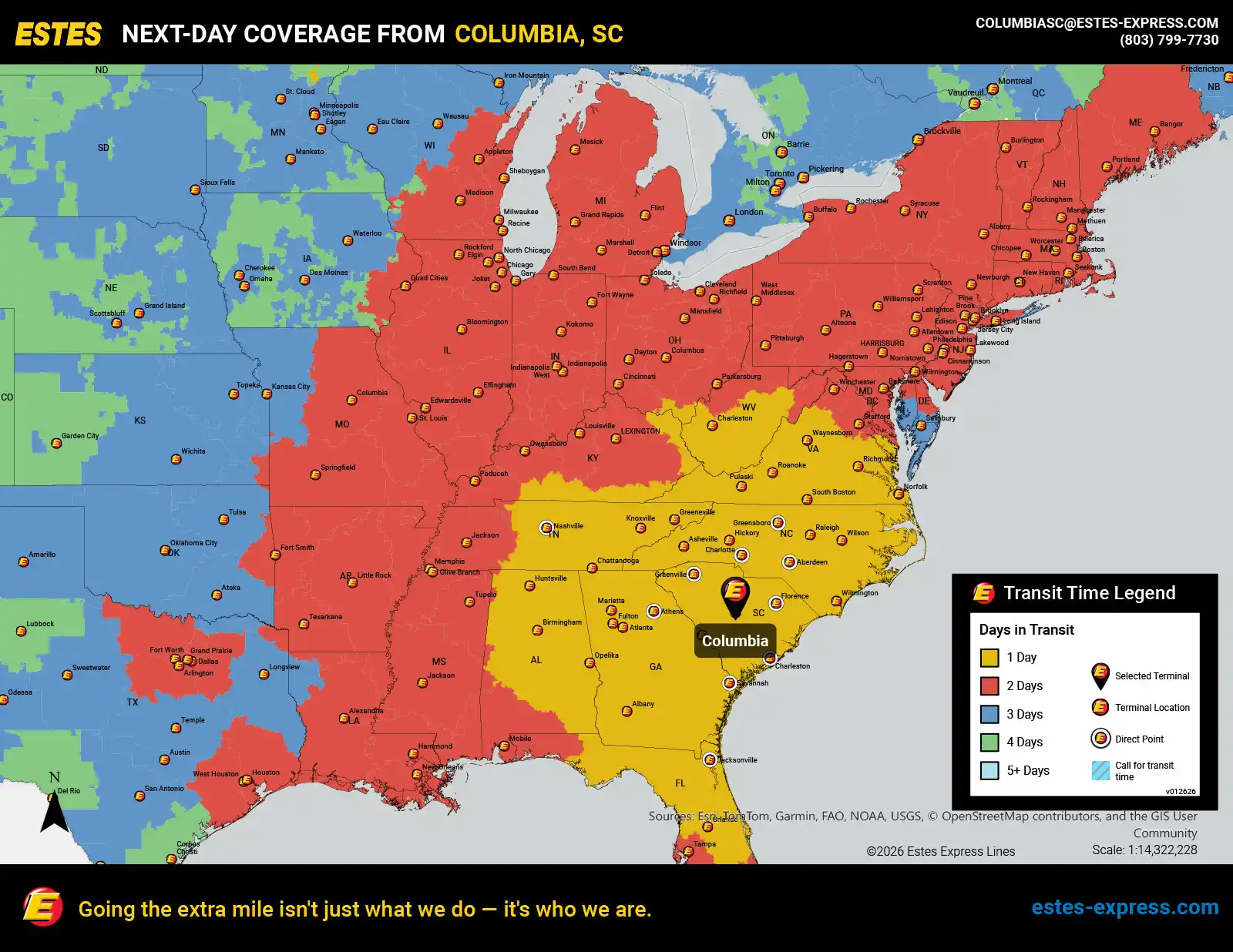 Estes offers next-day direct LTL freight shipping from Columbia to Charlotte, Jacksonville, Nashville, Greensboro, Charleston, and Savannah, as well as next-day LTL to Atlanta, Orlando, Raleigh, Birmingham, Richmond, Norfolk, Huntsville, Chattanooga, Knoxville, and more.