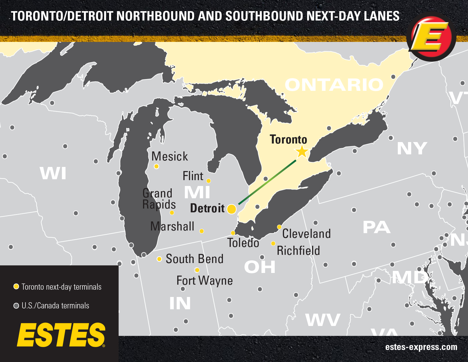 Estes offers next-day direct LTL freight shipping from Detroit to Chicago, Indianapolis, Cleveland, Columbus, Cincinnati, St. Louis, and Lexington, as well as next-day LTL to Toronto, Milwaukee, Pittsburgh, Buffalo, Louisville, and more.