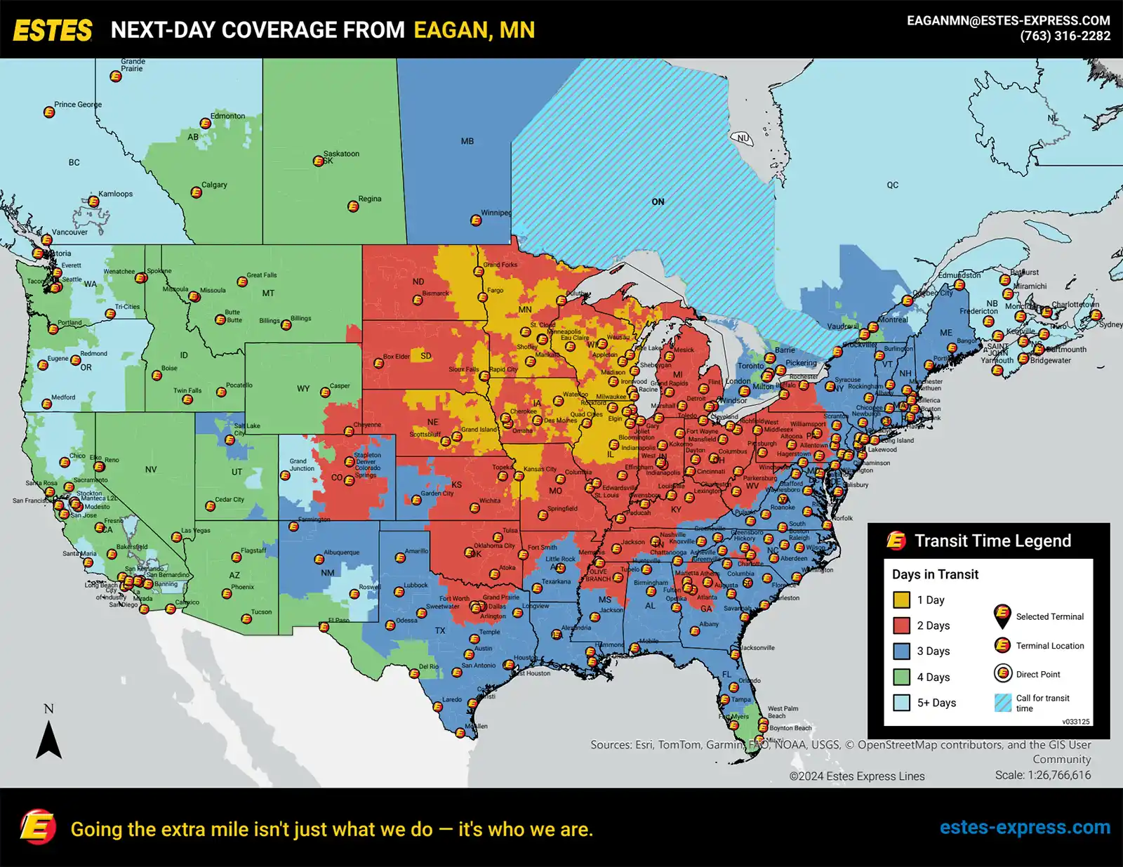Estes offers next-day LTL freight shipping from the Rochester-Bloomington-Eagan area to Chicago, Minneapolis, Kansas City, Milwaukee, Omaha, Des Moines, Madison, Sioux Falls, Quad Cities, Fargo, Joliet, Duluth, and more.
