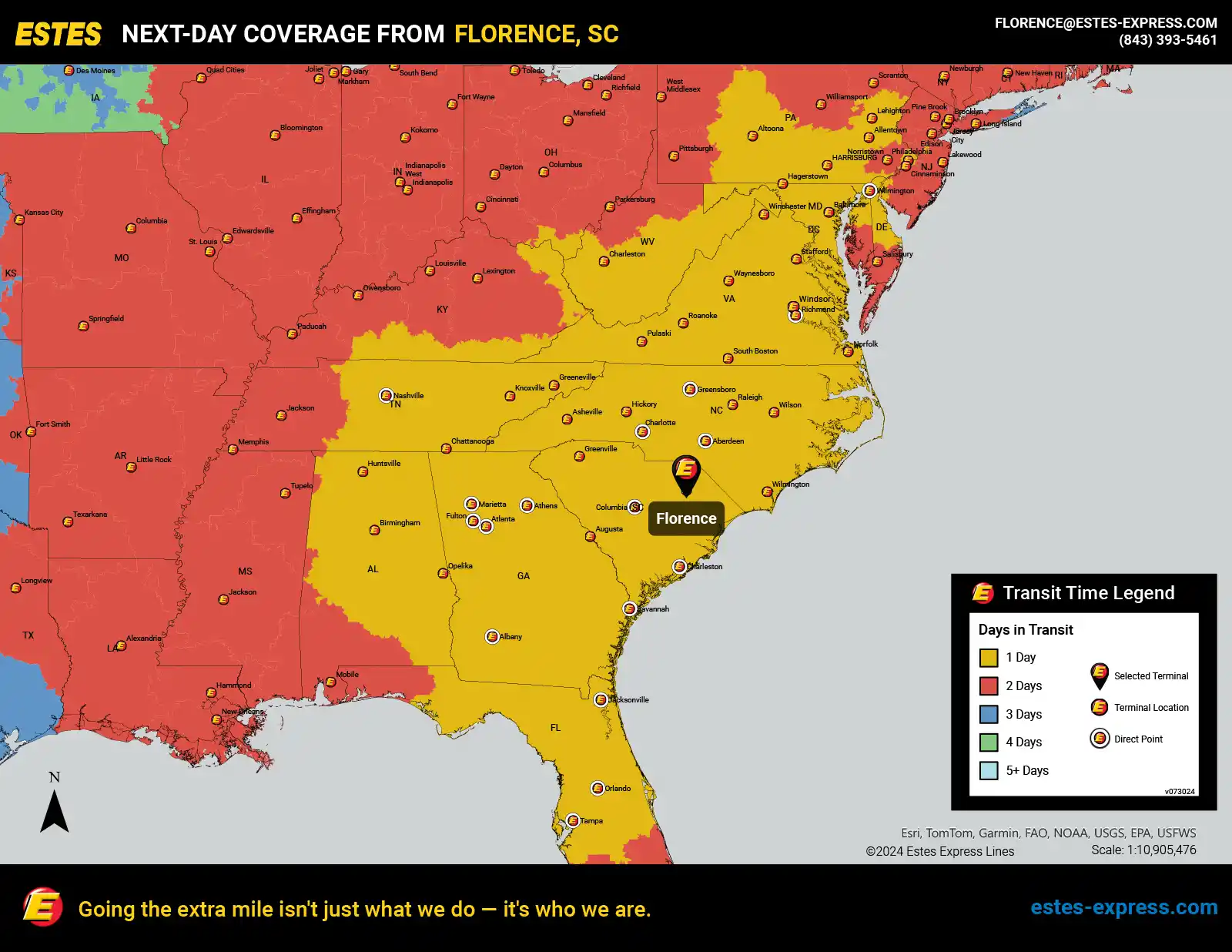 Need reliable LTL freight shipping? Estes offers next-day LTL from the Florence-Myrtle Beach area to Atlanta, Philadelphia, Charlotte, DC, Nashville, Jacksonville, Orlando, Baltimore, Raleigh, Richmond, Birmingham, and Norfolk.