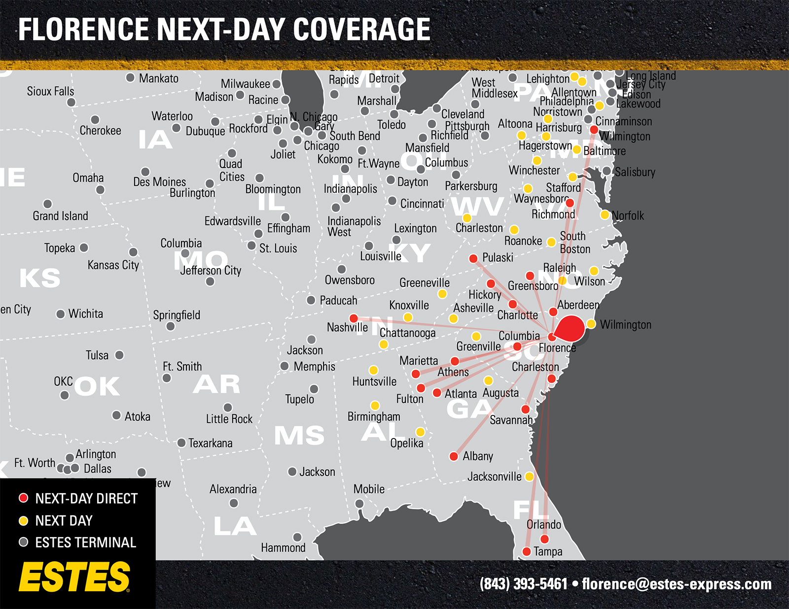 Need reliable LTL freight shipping? Estes offers next-day direct service from the Florence-Myrtle Beach area to Atlanta, Charlotte, Jacksonville, Tampa, Nashville, Orlando, Richmond, Greensboro, Charleston, Savannah, and Wilmington, DE, as well as next-day to Raleigh, Norfolk, Birmingham, Huntsville, Chattanooga, and more.