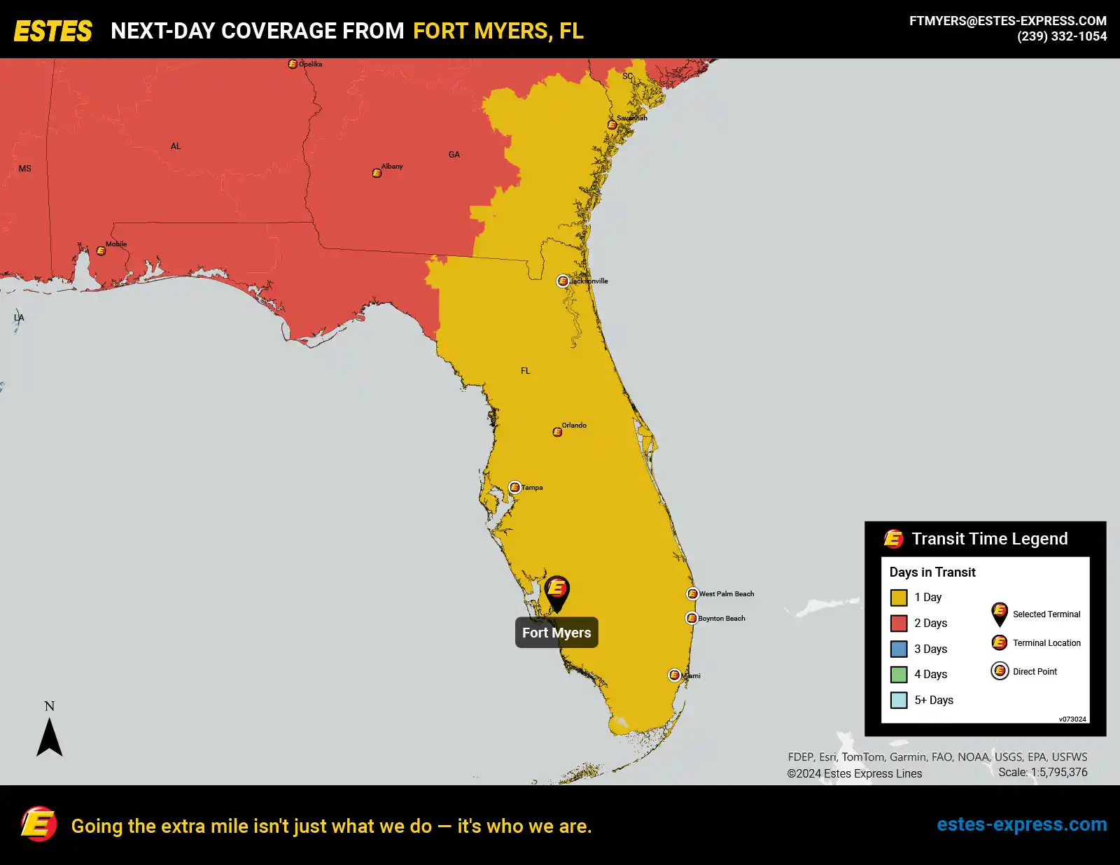 Estes offers next-day LTL freight shipping from the Fort Myers-Cape Coral FL area to Miami, Jacksonville, Orlando, Tampa, Savannah—and more.