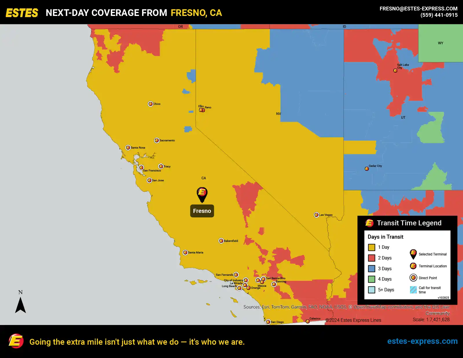Estes offers next-day direct LTL freight shipping from the Fresno-Visalia-Clovis area to Los Angeles, San Francisco, San Diego, Las Vegas, San Jose, Sacramento, San Bernardino, Riverside, Bakersfield, Chico, and more, as well as next-day LTL to Reno.