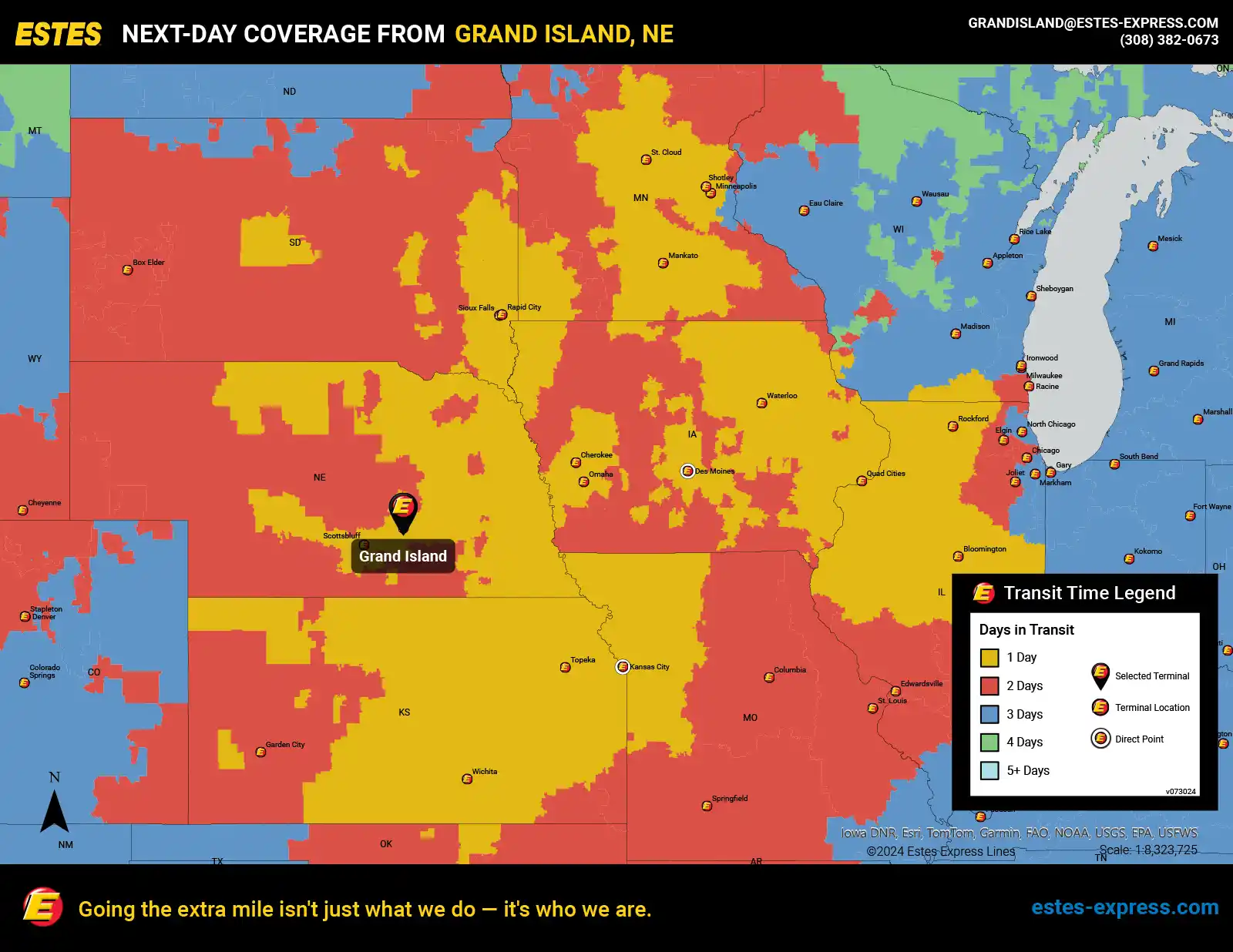 Estes offers next-day LTL freight shipping from the Grand Island-Kearny area to Kansas City, Omaha, Bloomington, Rochester, Rockford—and more.
