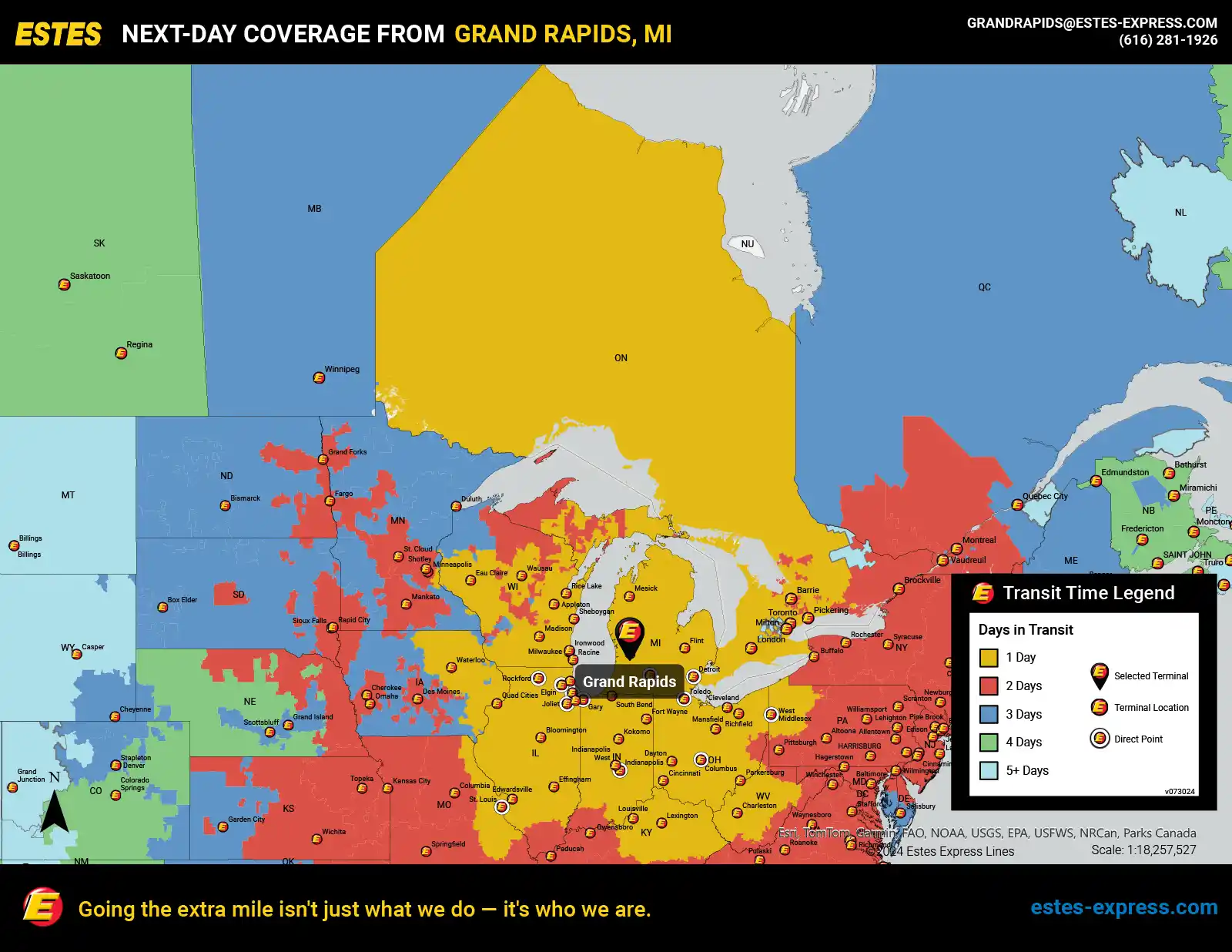 Estes offers next-day LTL freight shipping from Grand Rapids to Chicago, Detroit, Toronto, Indianapolis, Milwaukee, Cincinnati, Cleveland, Columbus, St. Louis, Louisville, Lexington, Toledo—and more.