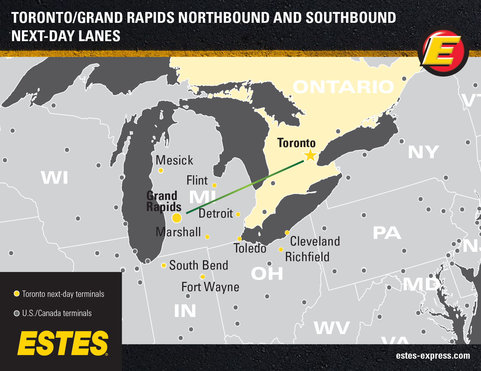 Estes offers next-day direct LTL shipping from Grand Rapids to Chicago, Indianapolis, Detroit, Columbus, St. Louis, and Toledo, as well as next-day LTL to Toronto, Milwaukee, Cleveland, Cincinnati, Louisville, Lexington, and more.