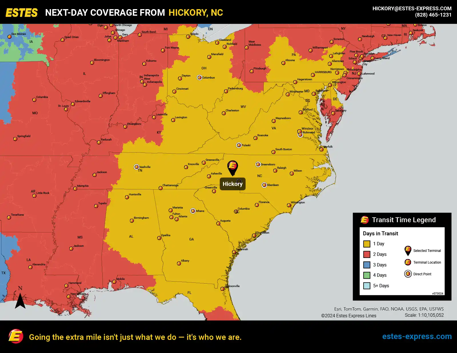 Estes offers next-day LTL freight shipping from the Hickory-Statesville-Boone area to destinations throughout the East, Southeast, and Midwest.