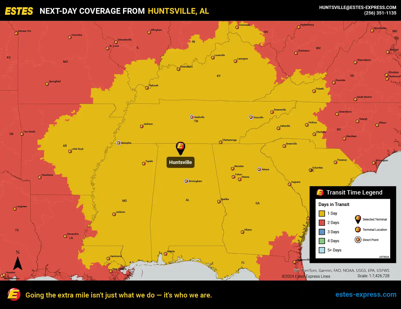 Estes offers next-day LTL freight shipping from Huntsville to Atlanta, Nashville, Charlotte, Memphis, Cincinnati, Louisville, Lexington, Mobile, Birmingham, Charleston, Columbia, Savannah, Little Rock—and more.