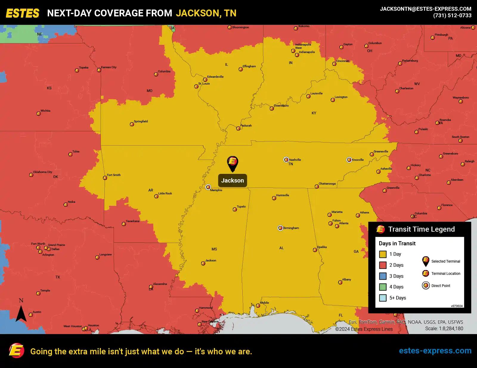 Estes offers next-day LTL freight shipping from the Jackson-Madison County area to Atlanta, Indianapolis, Nashville, Cincinnati, St. Louis, Memphis, Louisville, Lexington, Birmingham, Huntsville, Mobile, Little Rock—and more.