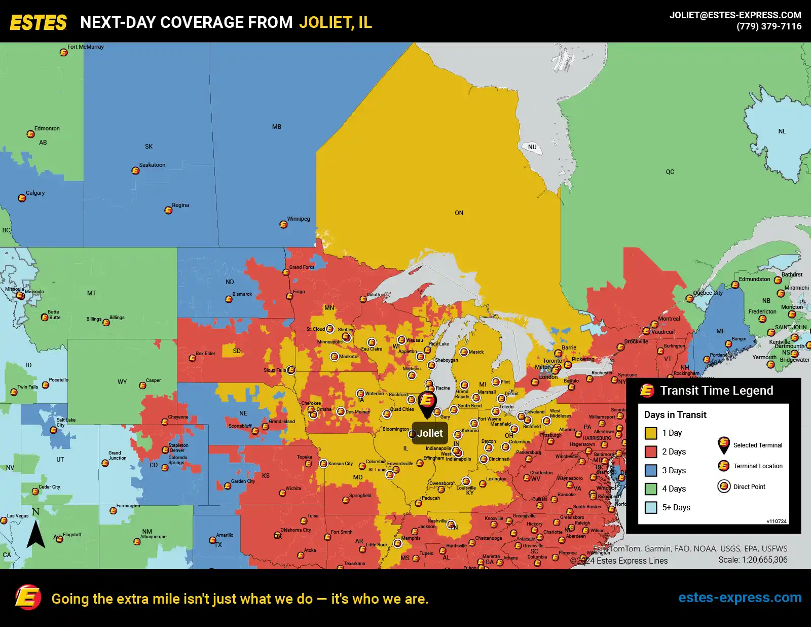 Estes also offers reliable next-day LTL shipping from Joliet to Toronto and Windsor—supported by our nationwide team of Border Concierges and featuring some of the best freeze protection in the industry!