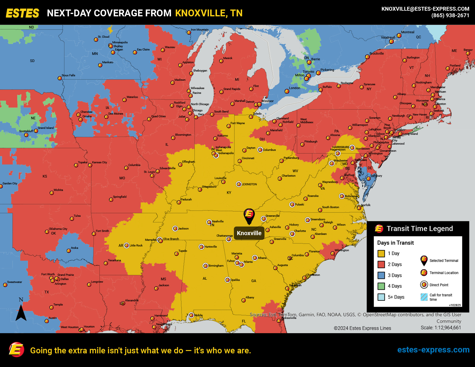 Need reliable LTL freight shipping? Estes offers next-day direct lanes from Knoxville to Atlanta, Charlotte, Indianapolis, Columbus, Nashville, Lexington, Richmond, Huntsville, Birmingham, Mobile, and Chattanooga, as well as next-day shipping to Cincinnati, Raleigh, Louisville—and more.
