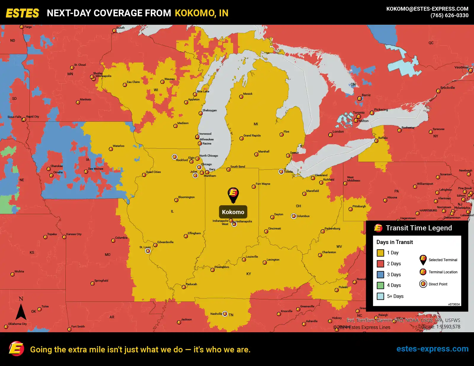 Estes offers next-day LTL freight shipping from the Caramel-Lafayette-Kokomo area to Chicago, Indianapolis, Nashville, Cincinnati, Cleveland, Columbus, Milwaukee, Detroit, Pittsburgh, St. Louis, Buffalo, Louisville, and more.