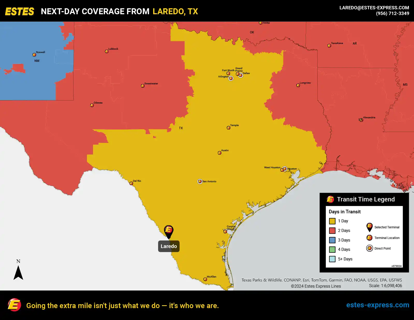 Estes offers next-day LTL freight shipping from Laredo to Houston, Dallas, Fort Worth, San Antonio, McAllen, Austin, Corpus Christi—and more.