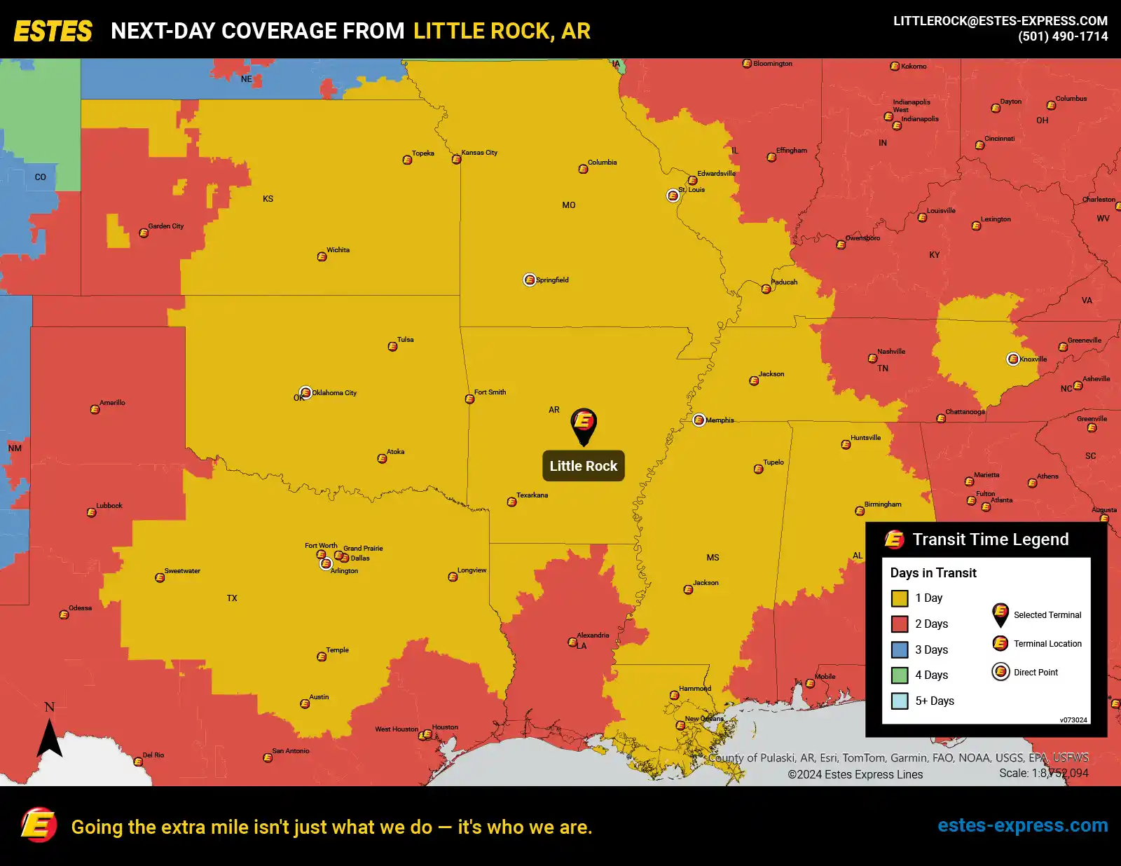 Estes offers next-day LTL freight shipping from Little Rock to Dallas, Fort Worth, Austin, Oklahoma City, Kansas City, Tulsa, Memphis, St. Louis, New Orleans, Wichita, Topeka, Columbia, Huntsville—and more.