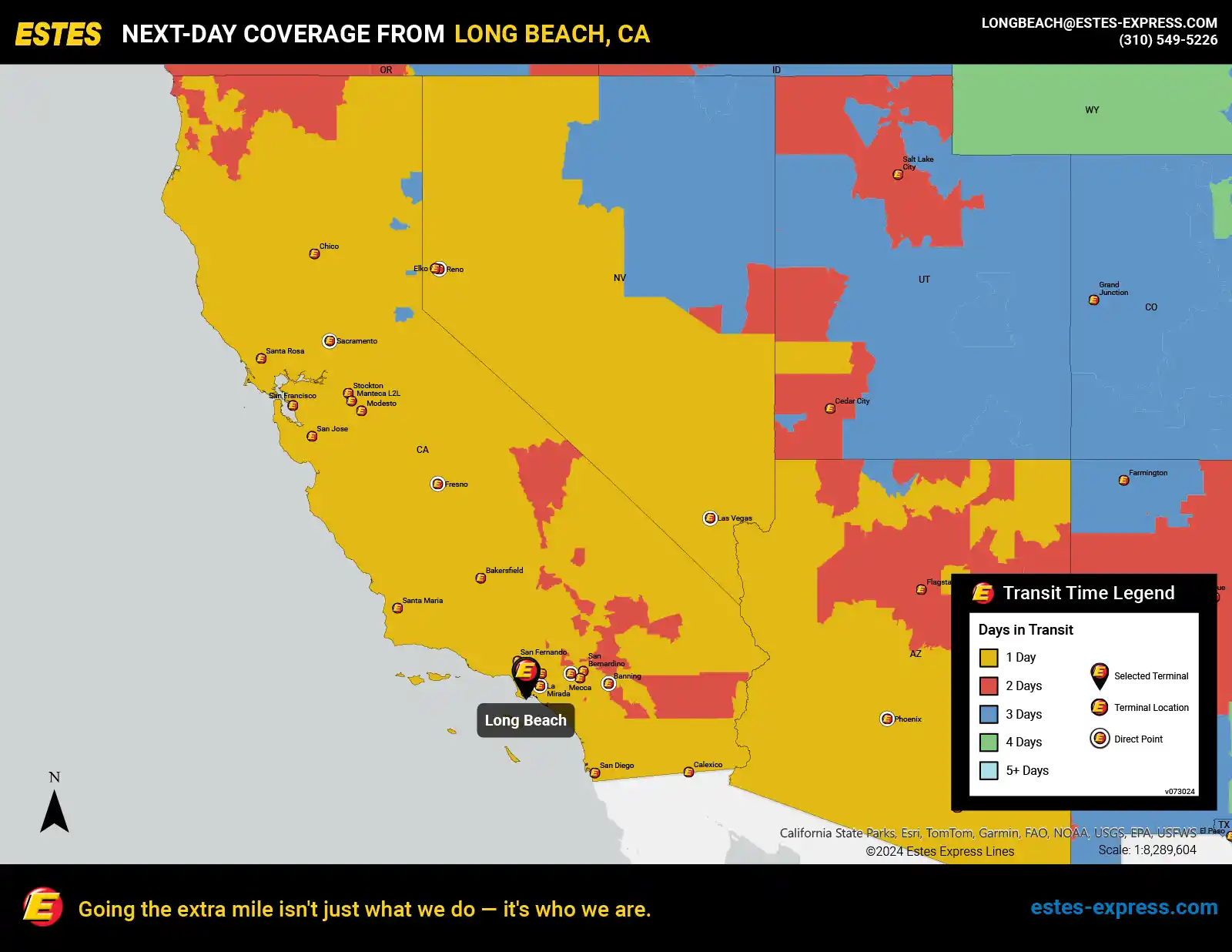 Estes offers next-day LTL freight shipping and trucking services from the South Los Angeles-Long Beach area to Phoenix, San Diego, San Francisco, San Jose, Sacramento, Las Vegas, Tucson, Fresno, Riverside, San Bernardino, Reno—and more.