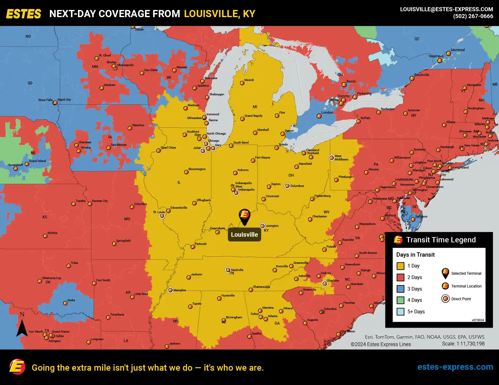 Estes offers next-day LTL freight shipping from Louisville to Chicago, Atlanta, Indianapolis, Nashville, Charlotte, Memphis, Pittsburgh, Milwaukee, Cleveland, Cincinnati, Columbus, Detroit, St. Louis, Lexington—and beyond.