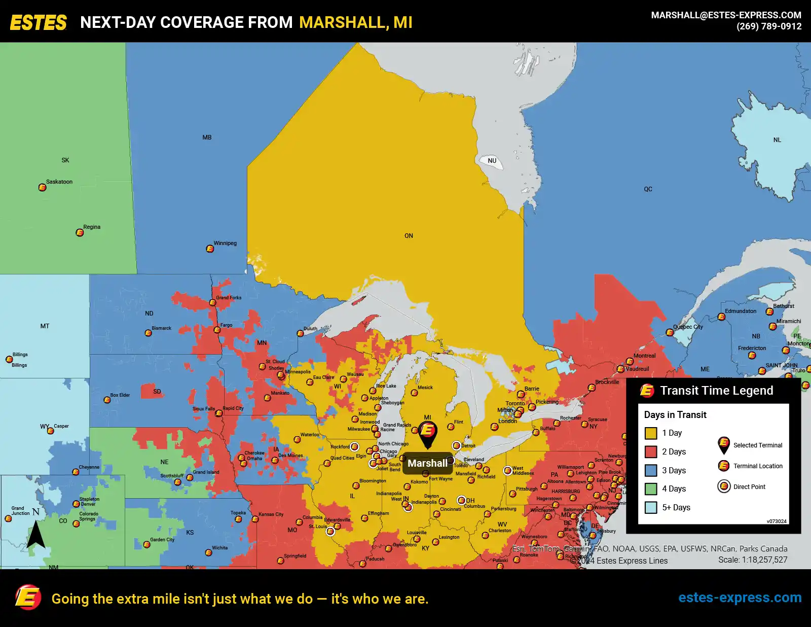 Estes also offers reliable next-day LTL shipping from the Lansing-Kalamazoo area to Toronto, London, and Windsor—supported by our nationwide team of Border Concierges and featuring some of the best freeze protection in the industry!