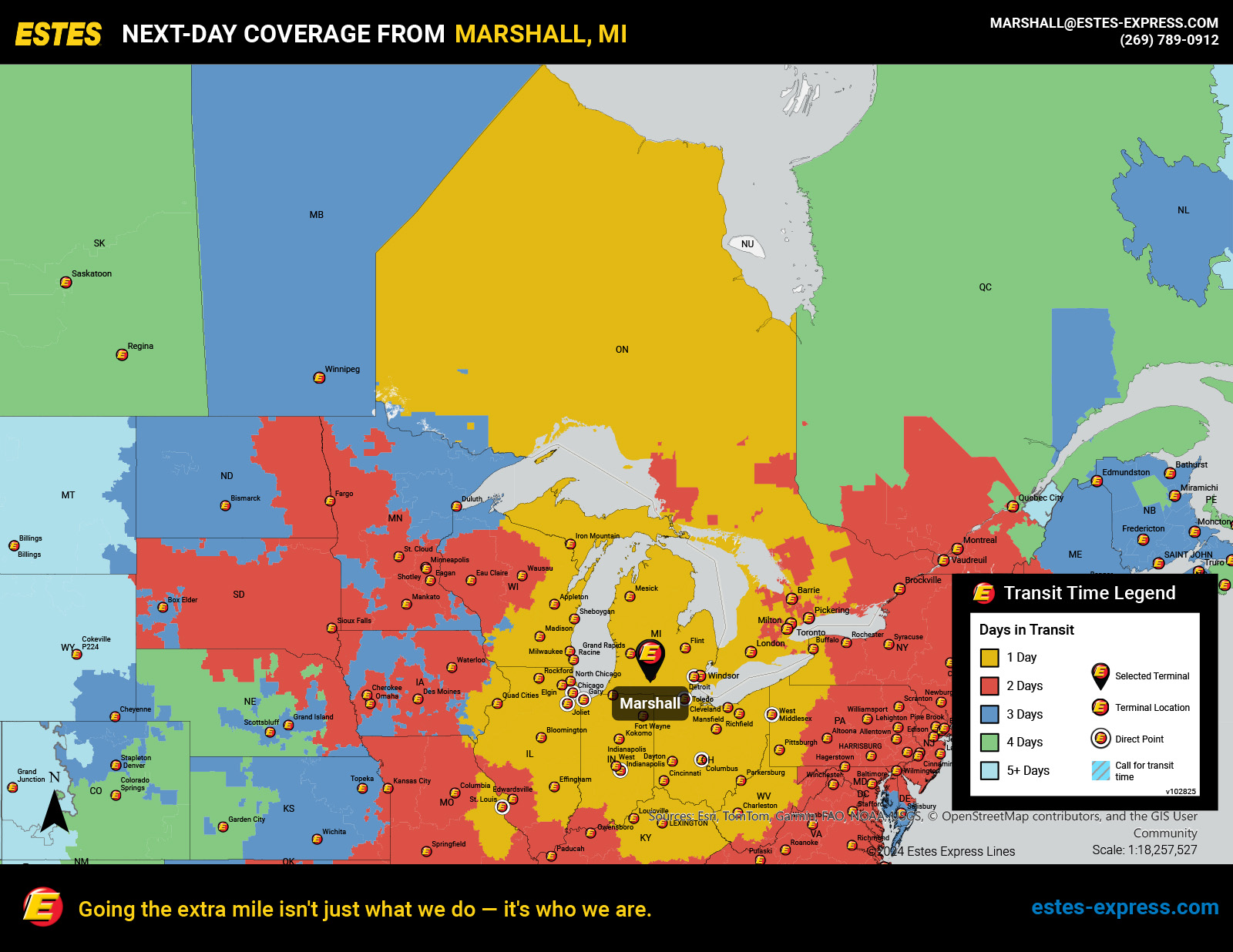 Estes offers next-day direct LTL shipping from the Lansing-Kalamazoo area to Chicago, Indianapolis, Detroit, Columbus, St. Louis, and Toledo, as well as next-day LTL to Minneapolis, Toronto, Cleveland, Cincinnati, Pittsburgh, Milwaukee, Buffalo, Louisville, Lexington, and more.