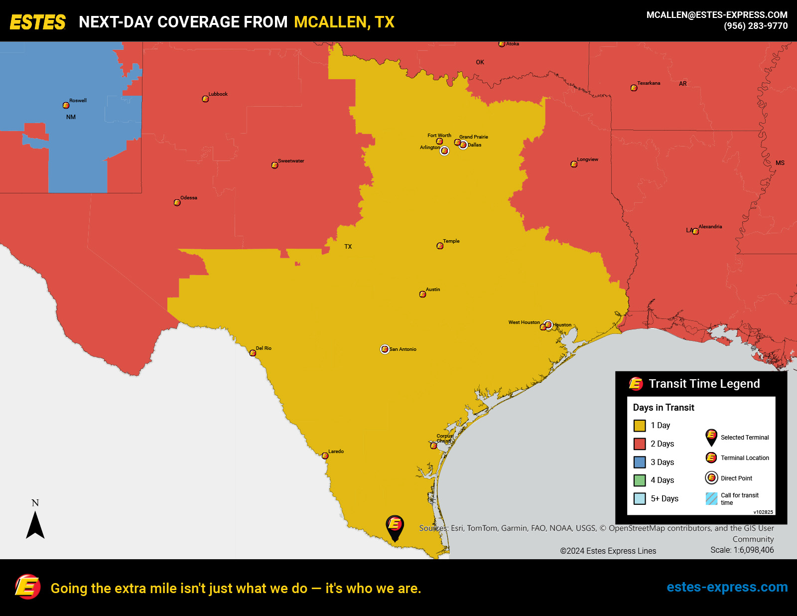 Estes offers next-day direct LTL freight shipping from the Rio Grande Valley—including McAllen, Brownsville, Pharr, Edinburg, and Mission—to Houston, Dallas, San Antonio, and Arlington, as well as next-day LTL to Austin, Fort Worth, Laredo, Corpus Christi, and more.