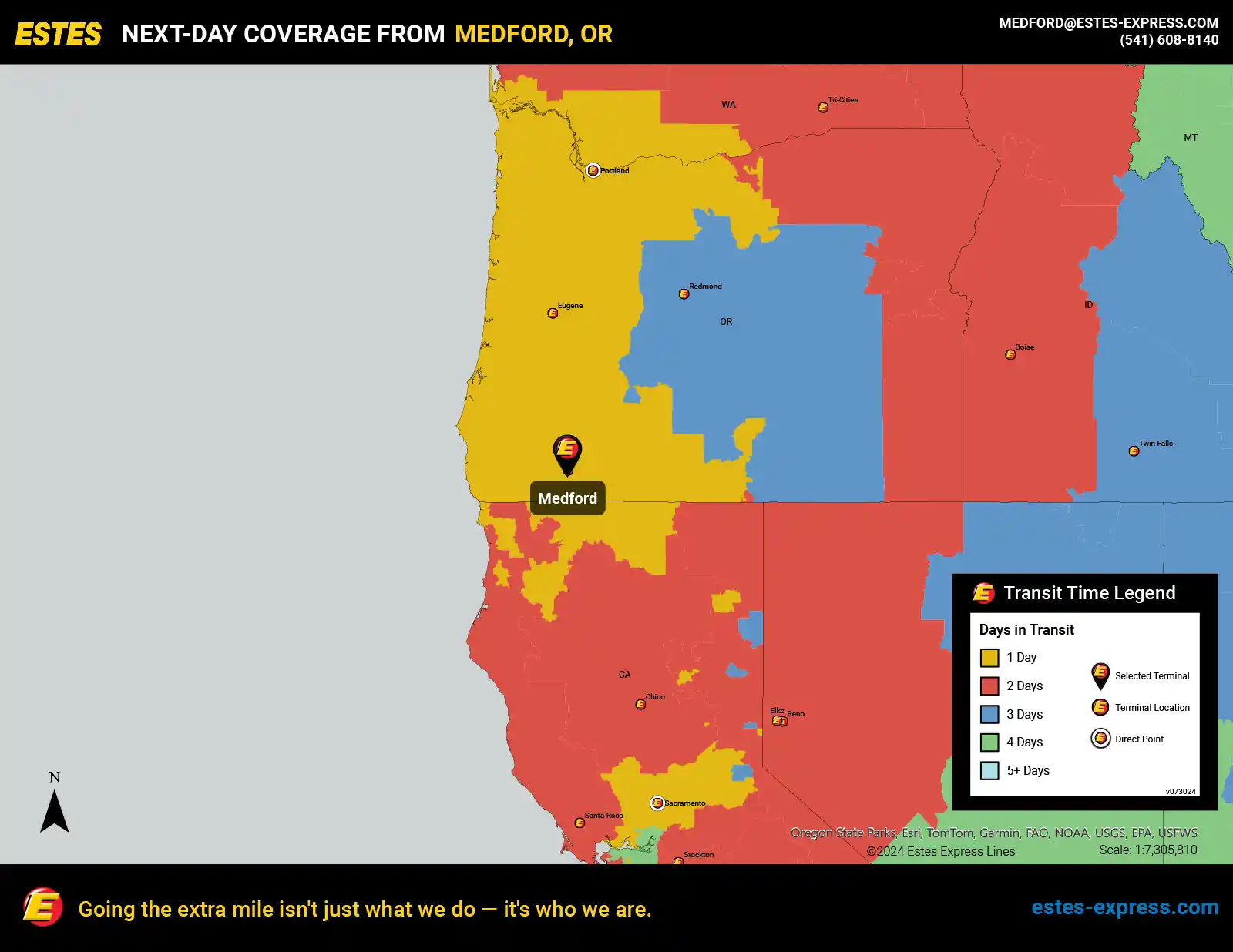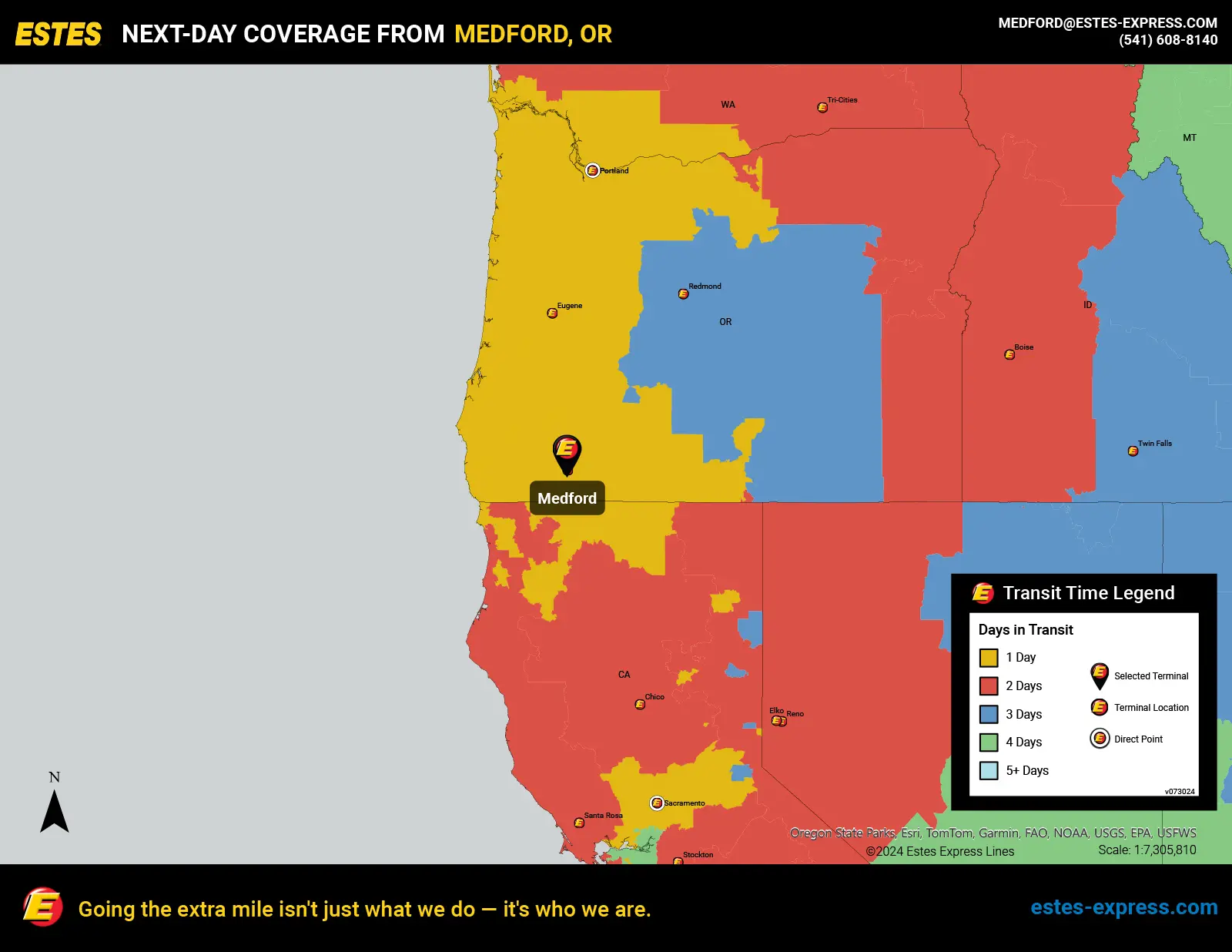Estes offers next-day LTL freight shipping from Medford to Portland, Sacramento, Eugene—and more.