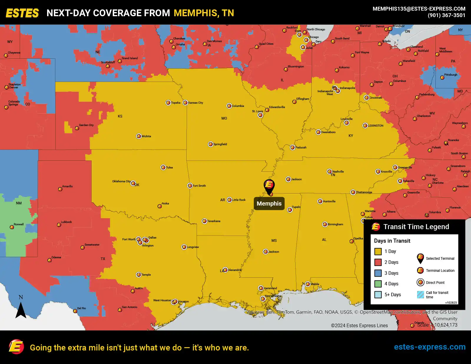 Need reliable LTL freight shipping? Estes offers next-day direct lanes from Memphis to Chicago, Houston, Dallas, Atlanta, Indianapolis, Oklahoma City, Kansas City, Nashville, Cincinnati, St. Louis, Tulsa, New Orleans, Louisville, Lexington, Wichita, Huntsville, Birmingham, Little Rock, Knoxville—and more.