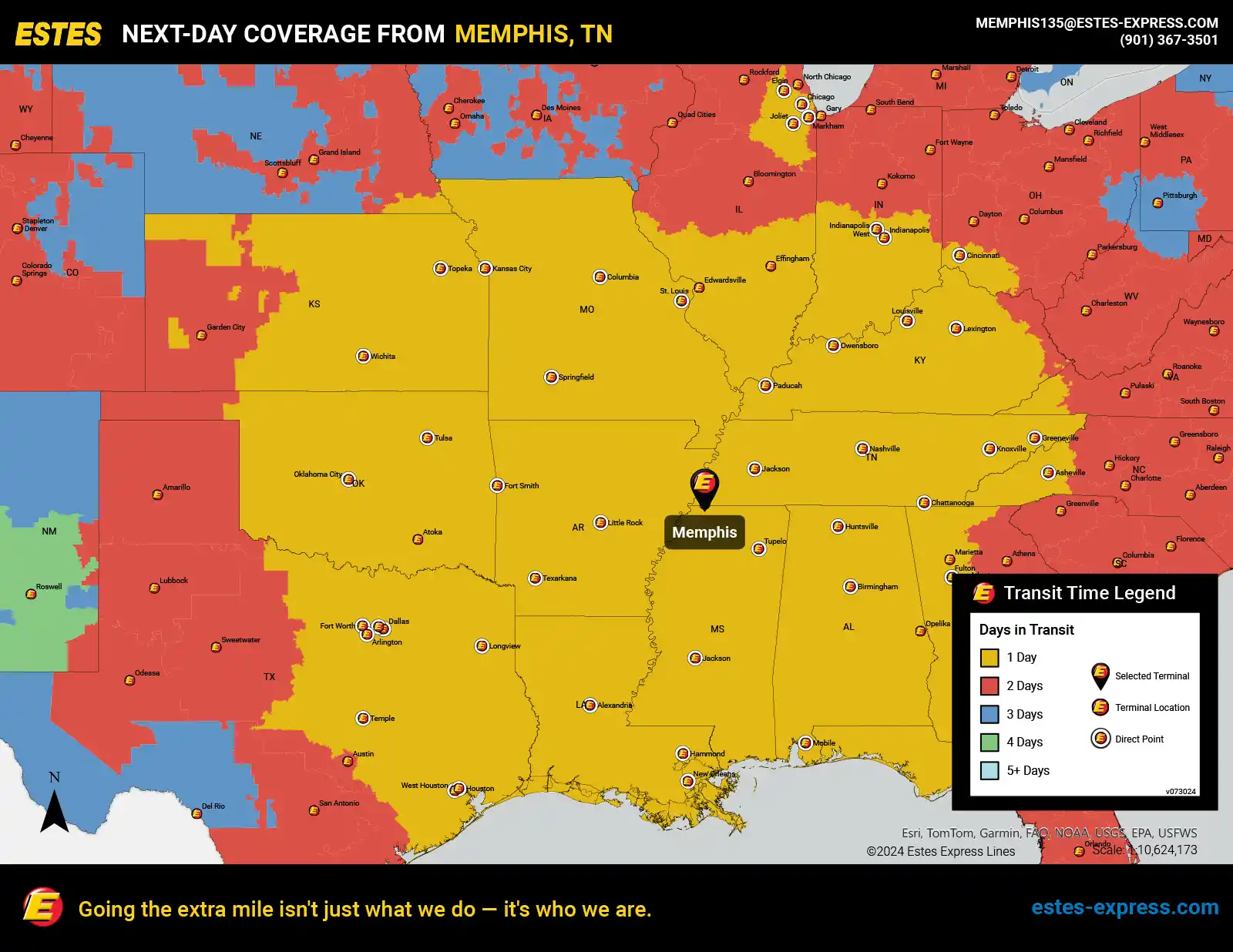 Estes offers next-day LTL freight shipping from Memphis to Chicago, Houston, Atlanta, Dallas, Charlotte, Indianapolis, Nashville, Oklahoma City, Fort Worth, Kansas City, Cincinnati, St. Louis, Tulsa, New Orleans—and more.