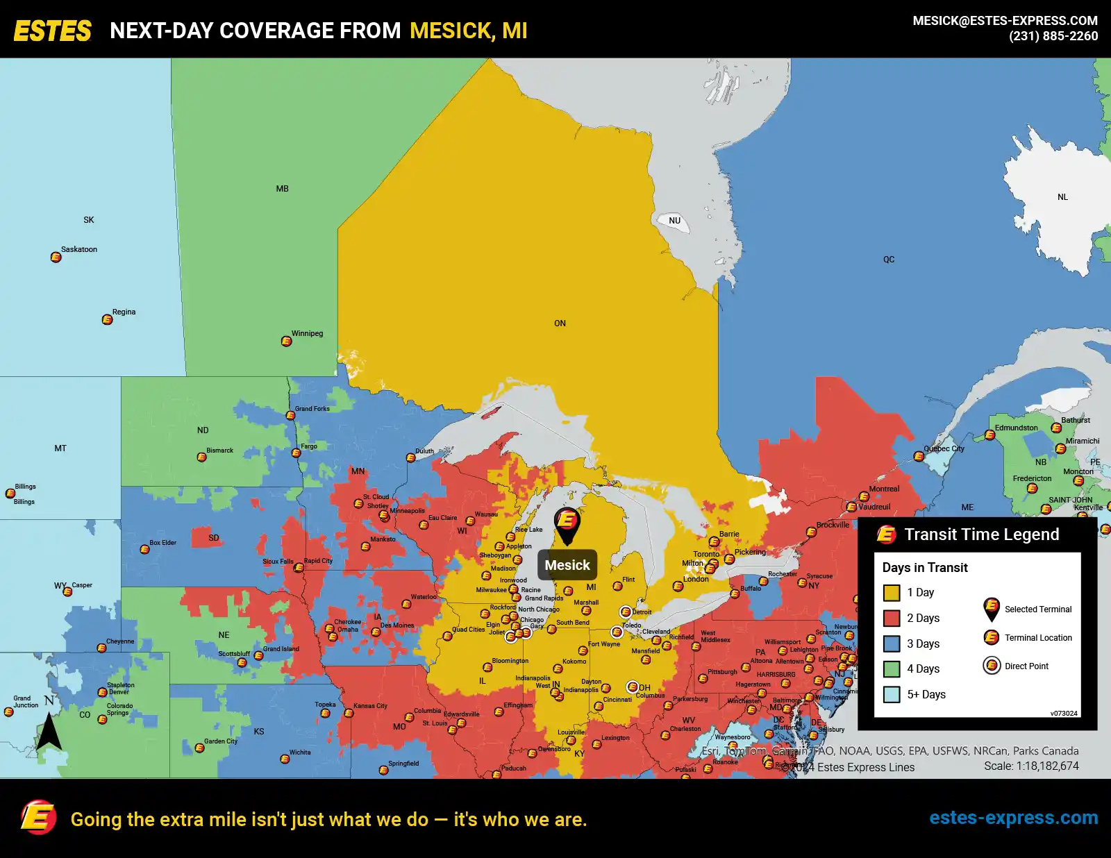 Estes offers next-day LTL freight shipping from the Mount Pleasant-Traverse City area to Chicago, Indianapolis, Detroit, Toronto, Milwaukee, Cleveland, Cincinnati, Columbus, Louisville, Toledo—and more.