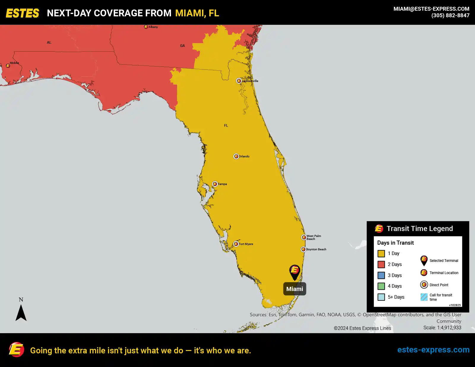 Estes offers next-day direct LTL freight shipping from Miami to Tampa, Jacksonville, Orlando, Fort Lauderdale, Fort Myers, West Palm Beach, and Boynton Beach.