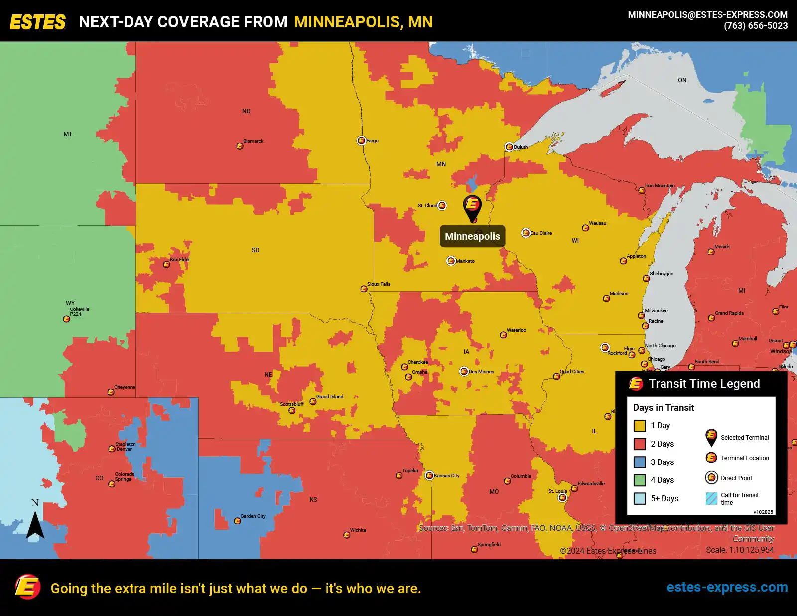 Estes offers next-day LTL freight shipping from Minneapolis-St. Paul to Chicago, Kansas City, St. Louis, Milwaukee, Omaha, Des Moines, Madison, Duluth, Sioux Falls, Fargo, and more.