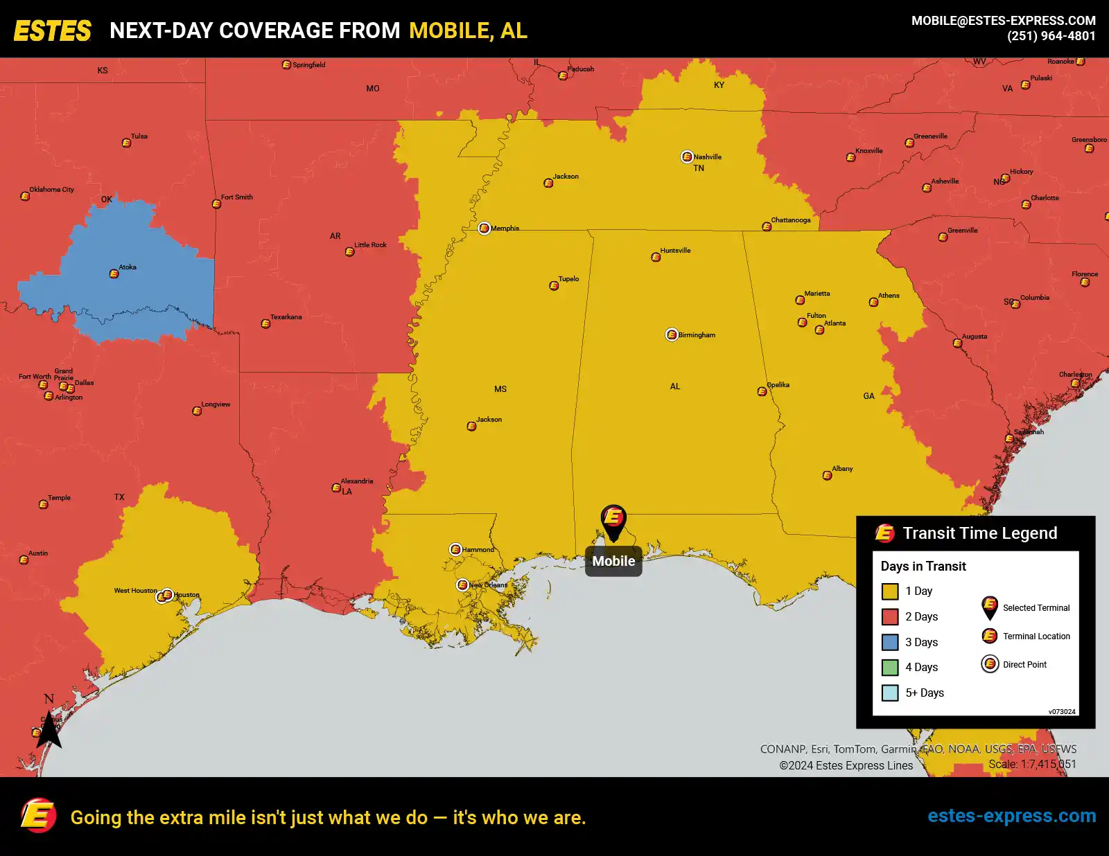Estes offers next-day LTL shipping from Mobile to Houston, Atlanta, Nashville, Jacksonville, Memphis, Orlando, Tampa, New Orleans, Birmingham, Chattanooga—and more.