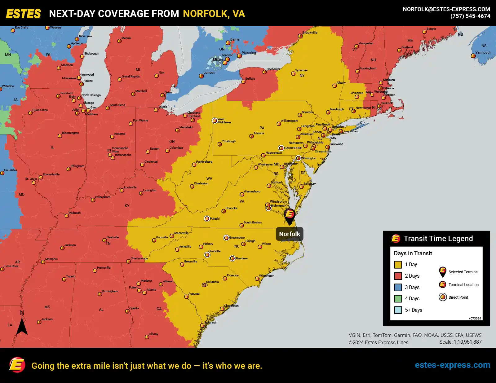Estes offers next-day LTL freight shipping from Norfolk, Virginia Beach, Chesapeake—and throughout Hampton Roads—to destinations across the east.