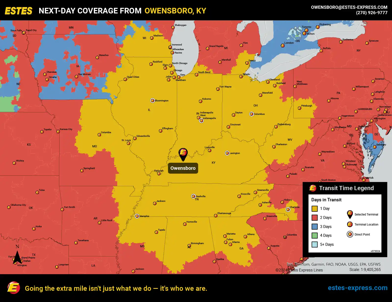 Estes offers next-day LTL freight shipping from the Evansville-Owensboro area to Chicago, Atlanta, Indianapolis, Charlotte, Nashville, Detroit, Milwaukee, Cleveland, Cincinnati, Memphis, Pittsburgh, Columbus, St. Louis, Louisville, Lexington—and more.