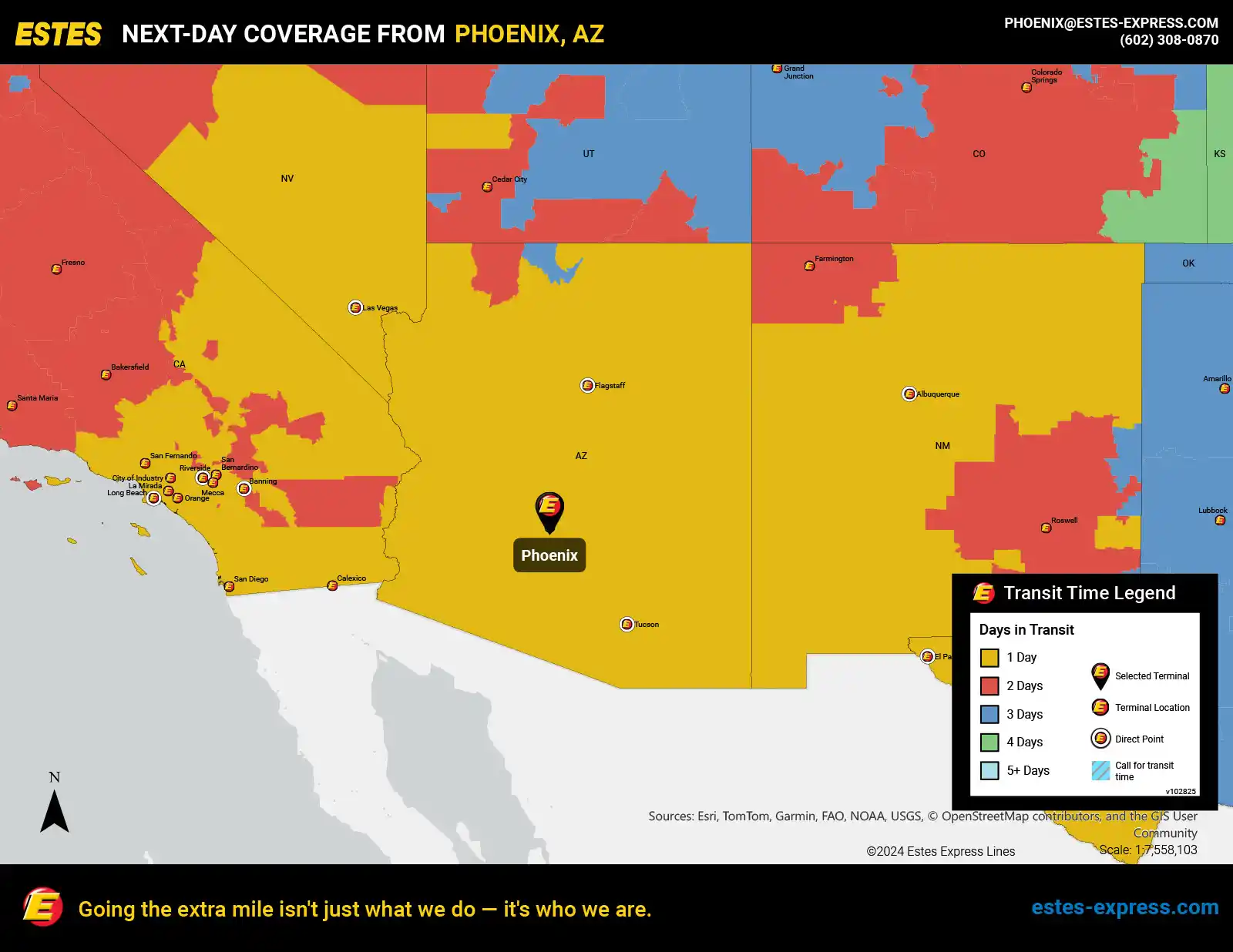 Estes offers next-day LTL freight shipping from the Phoenix-Mesa-Chandler area to Los Angeles, Las Vegas, San Diego, Tucson, El Paso, Albuquerque, Riverside, San Bernardino, Flagstaff, and more.